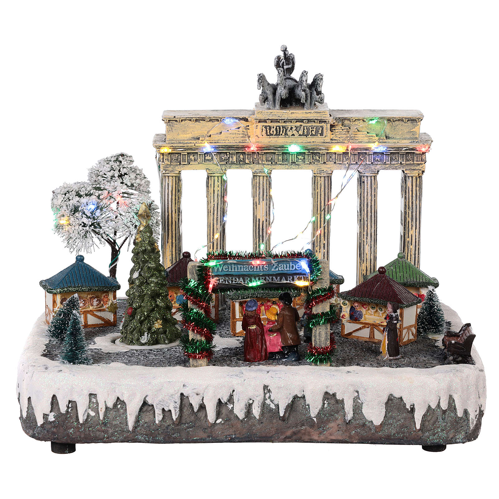 Cenário de Natal Berlim movimento luzes música 25x20x25 cm. Cenário natalino de Berlim em resina com Portão de Brandeburgo e mercado de Natal, animado por luzes, movimento e música (a música pode ser excluída).Artigo alimentado por ficha 220V.