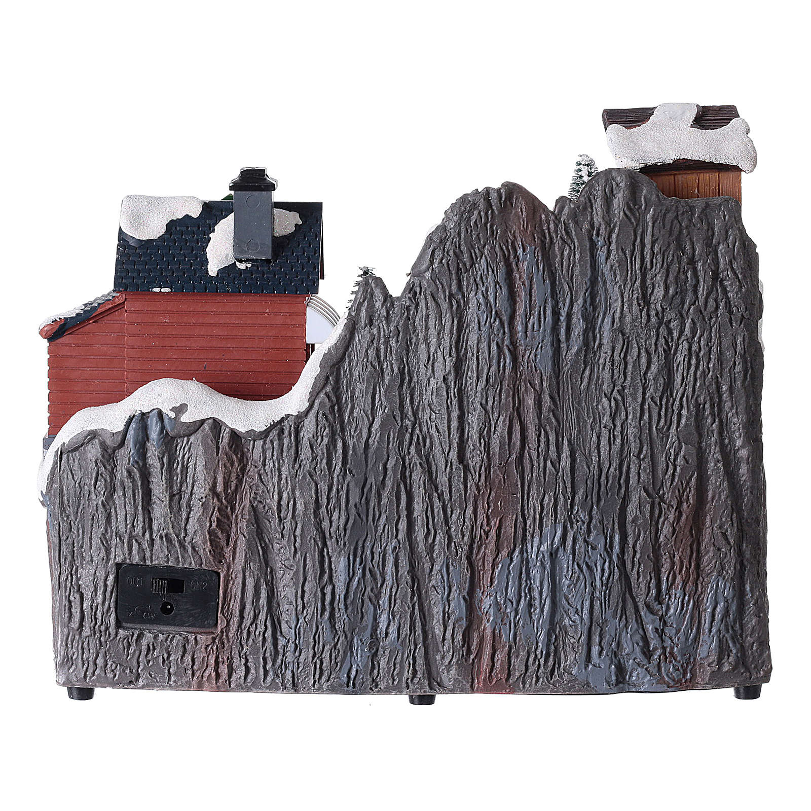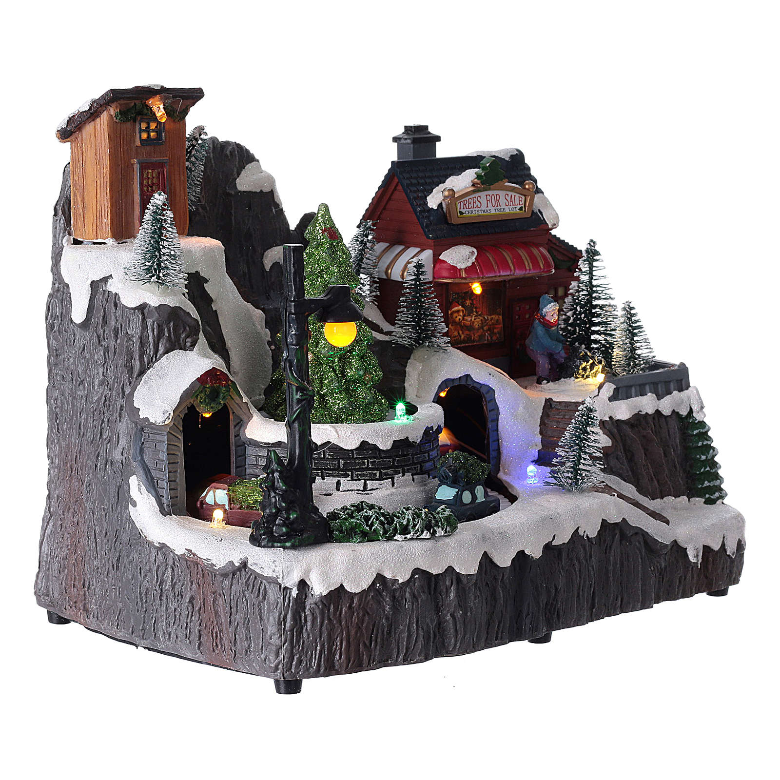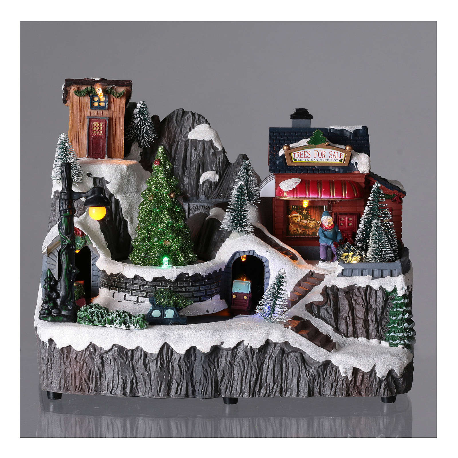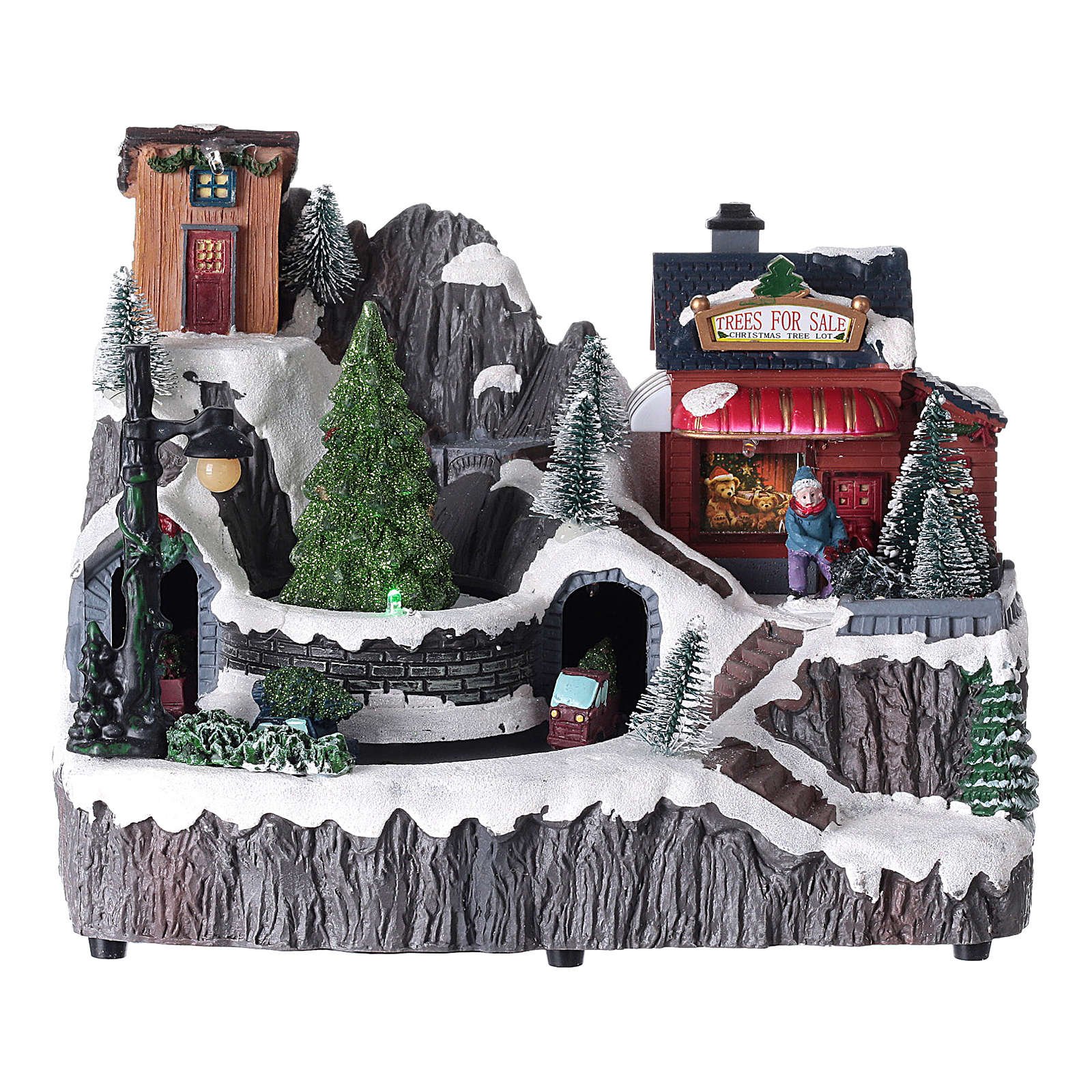 Cenário de Natal carros movimento luzes música 20x20x15 cm. Cenário de Natal com carros que entram e saem dum túnel e loja de árvores de Natal, realizado em resina.Uma alavanca permite de activar o movimento, as luzes e a música ou só o movimento e as luzes.Artigo alimentado por pilhas AA, não incluídas na embalagem.