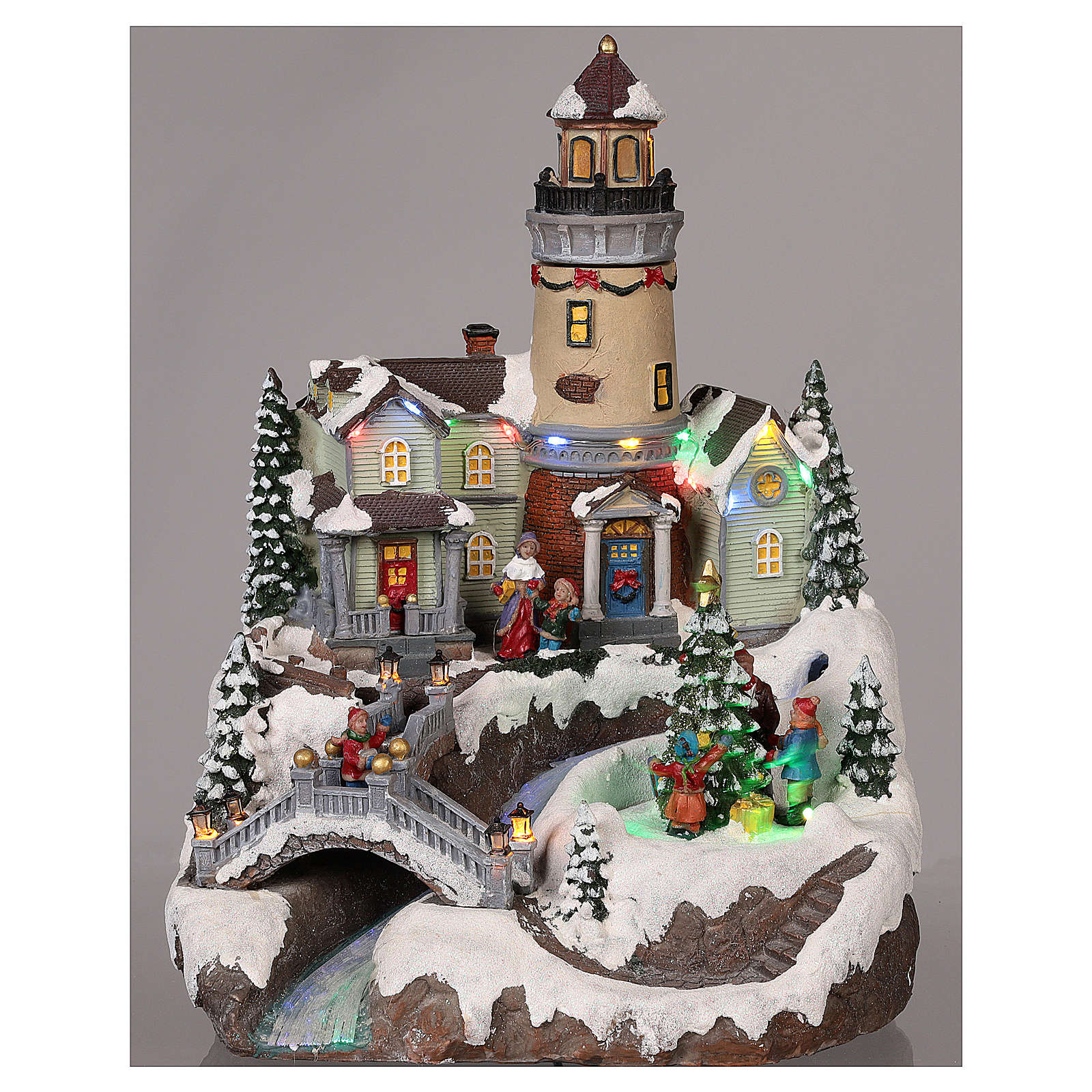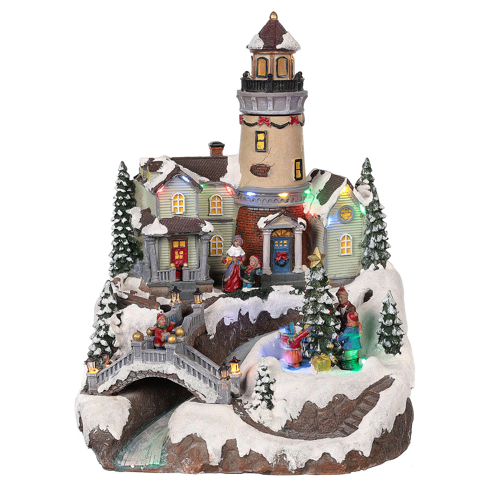 Cenário de Natal com farol movimento luzes música 35x25x25 cm. Cenário natalino em resina com farol e ponte, animado por luzes, movimento e música (a música pode ser excluída).Artigo alimentado por ficha 220V ou por pilhas.