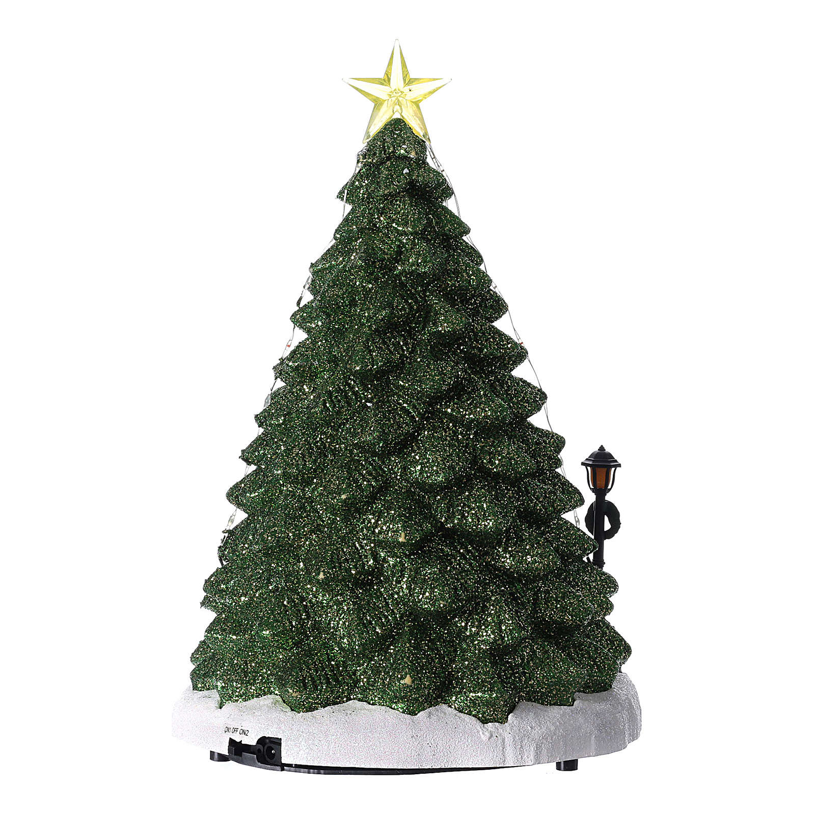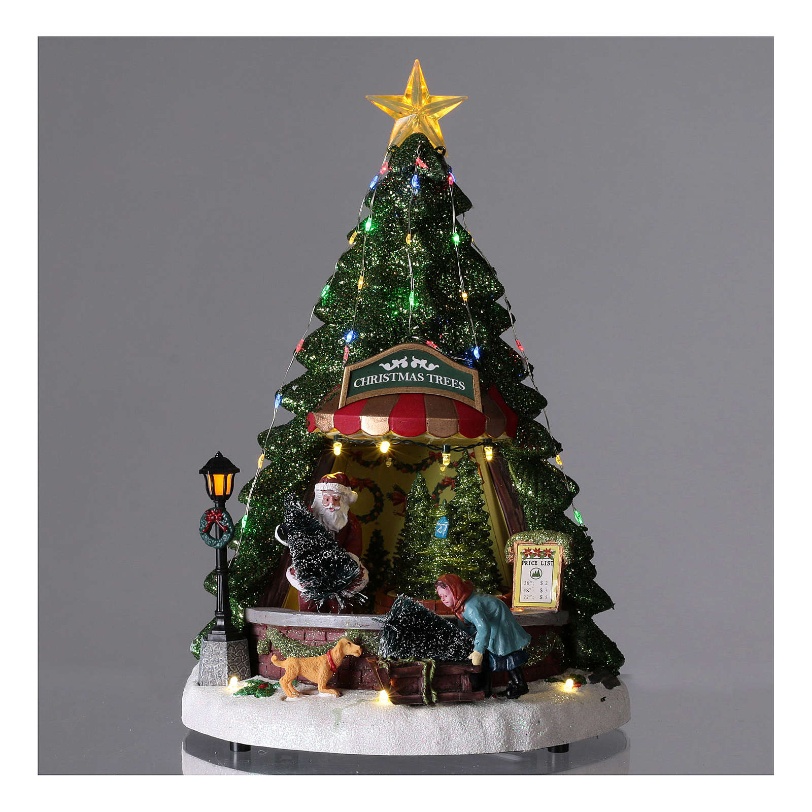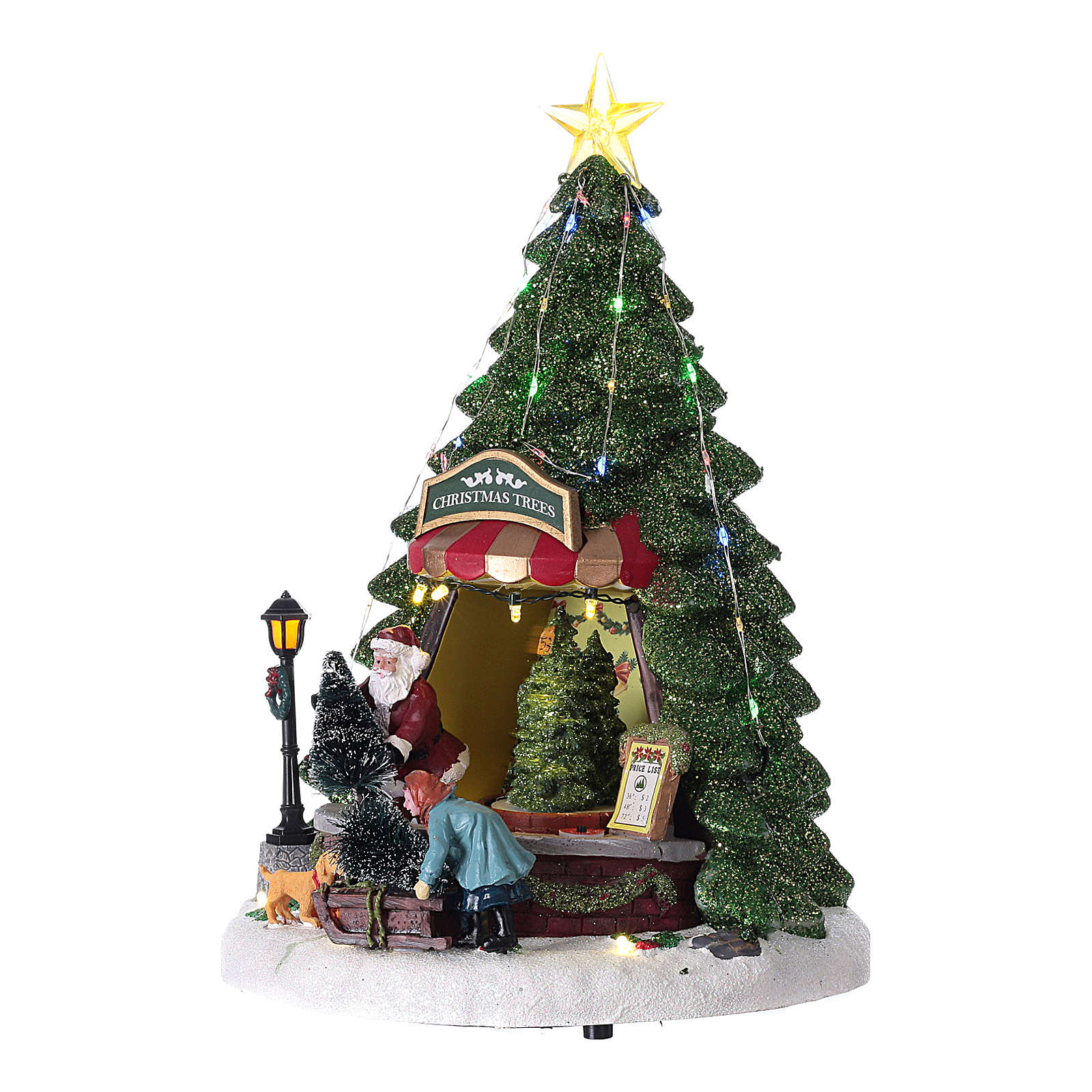 Cenário de Natal com Pai Natal e loja de árvores 34x22 cm. Cenário de Natal com Pai Natal numa loja de árvores de Natal, realizado em resina.Uma alavanca permite de activar o movimento, as luzes e a música ou só o movimento e as luzes.Modelo adequado por qualquer decoro, compatível com cenários do mesmo estilo (por exemplo MyVillage e Lemax).
