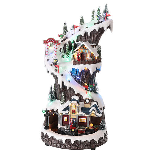 Cenário de Natal montanha, esquiadores e comboio movimento luzes LED 42x22x22 cm
