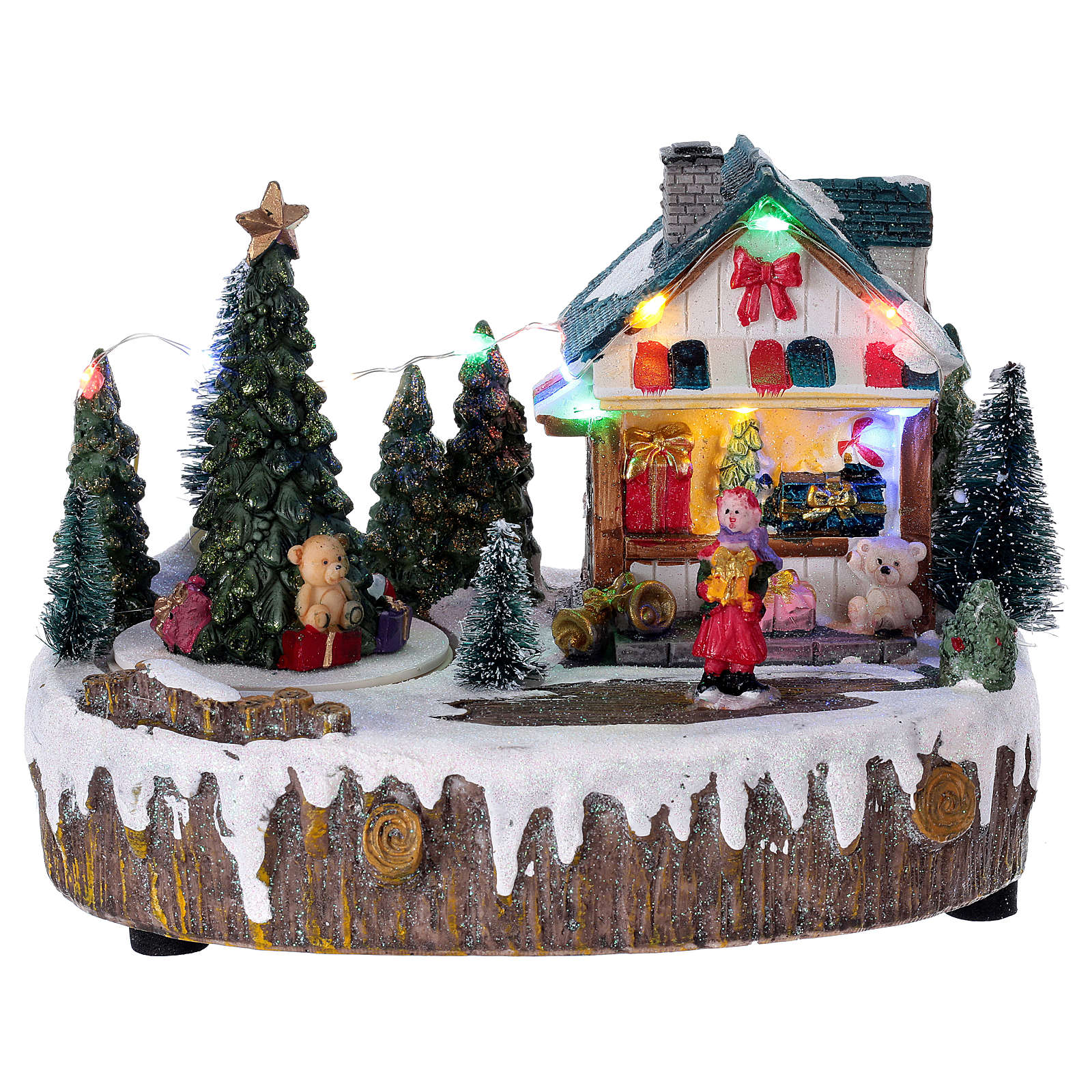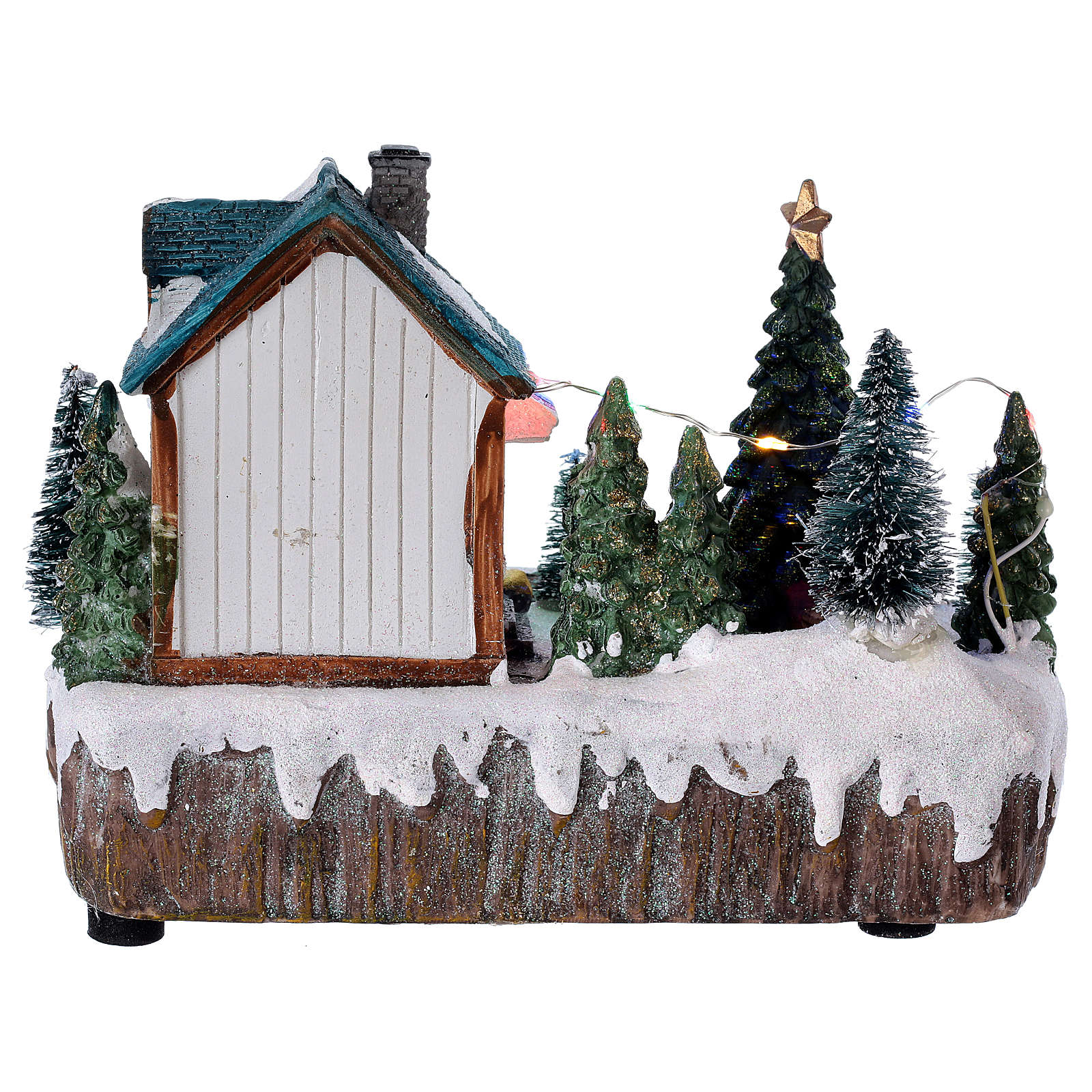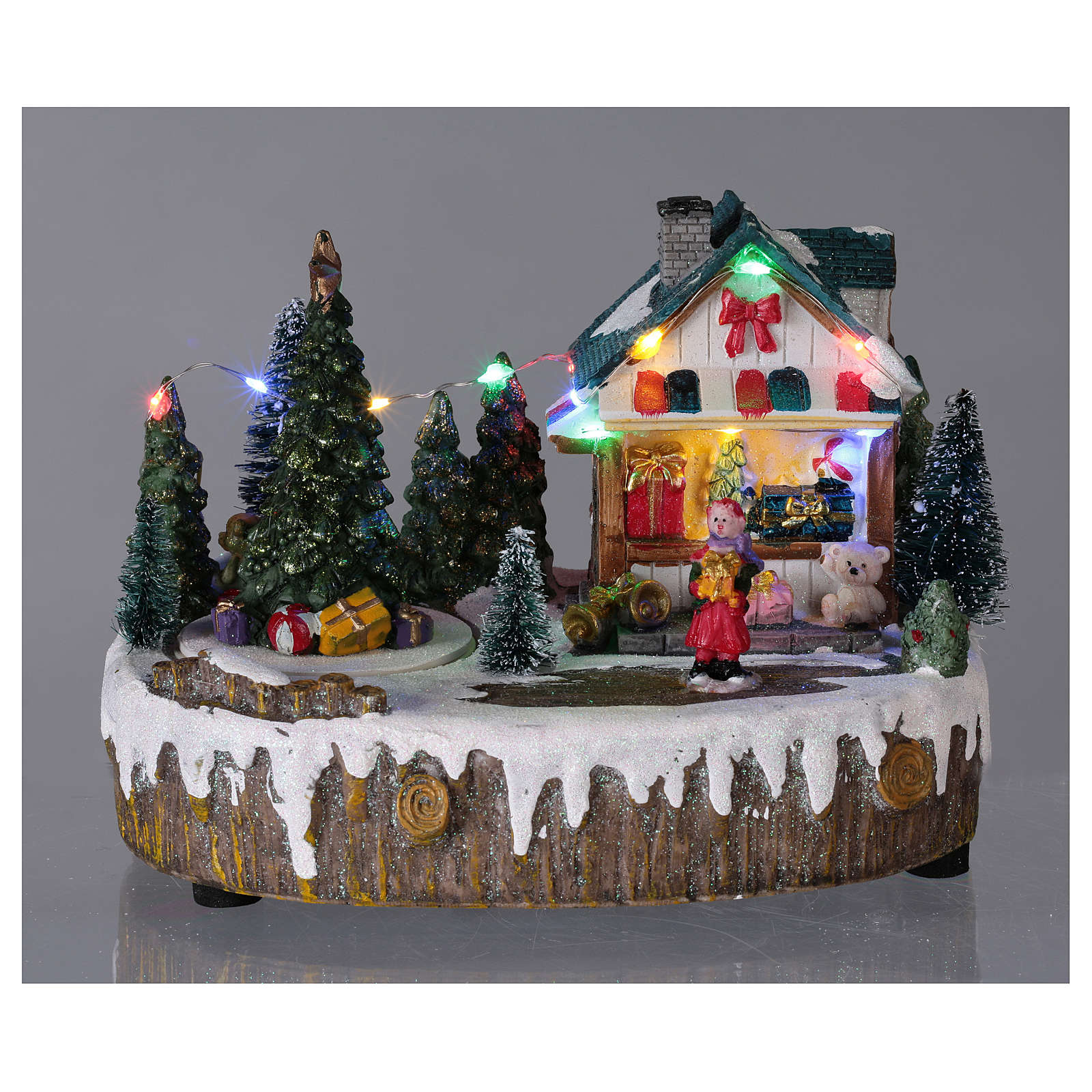 Cenário Natal 26x13x14 cm loja movimento árvore luzes. Cena de Natal com loja, figuras e árvore em movimento, realizada em resina com luzes Led.Paisagem em miniatura adequada por qualquer ambiente e compatível com todos os cenários e os acessórios do mesmo estilo (produtos MyVillage e cenários Lemax).Cena alimentada por pilhas (3 pilhas AA não incluídas).
