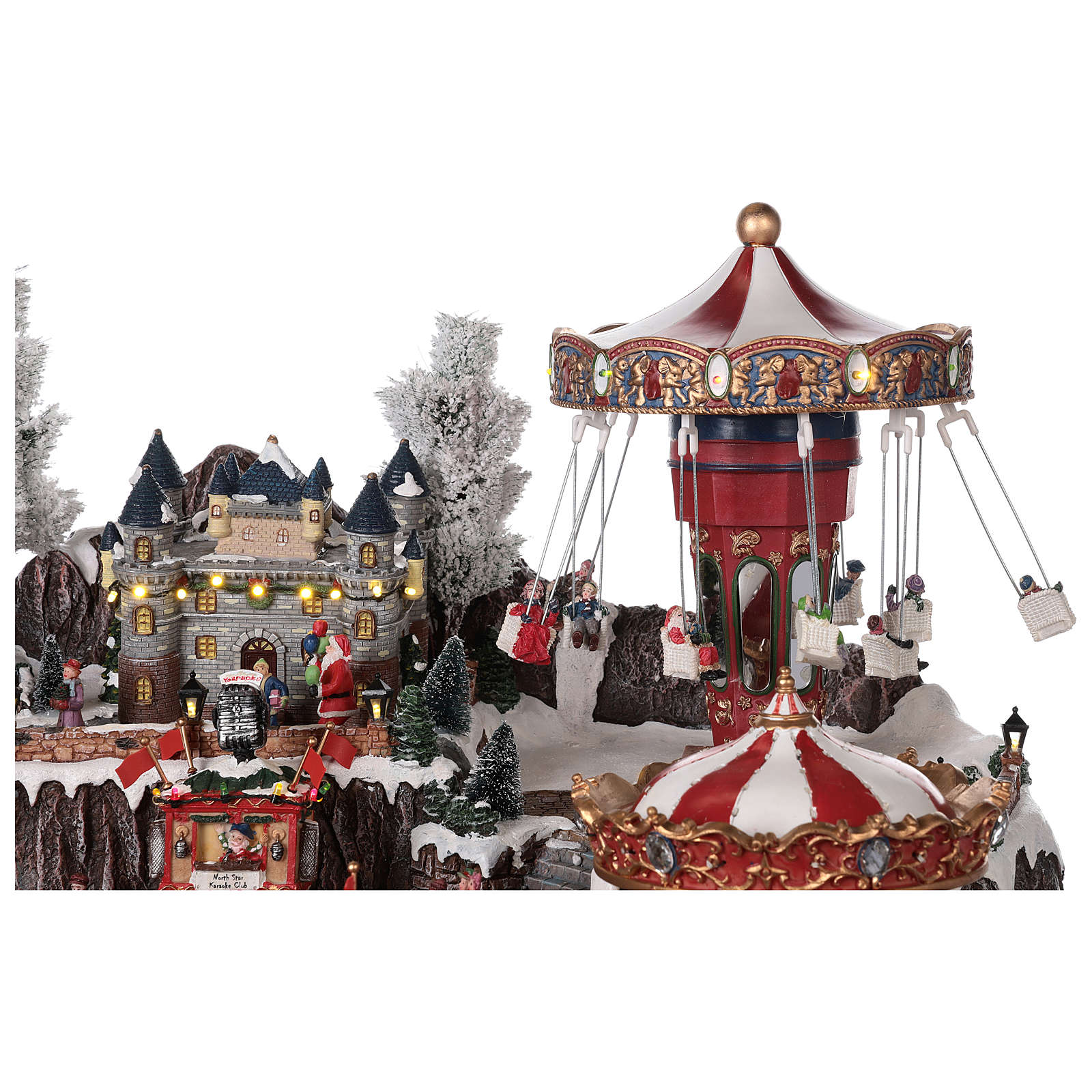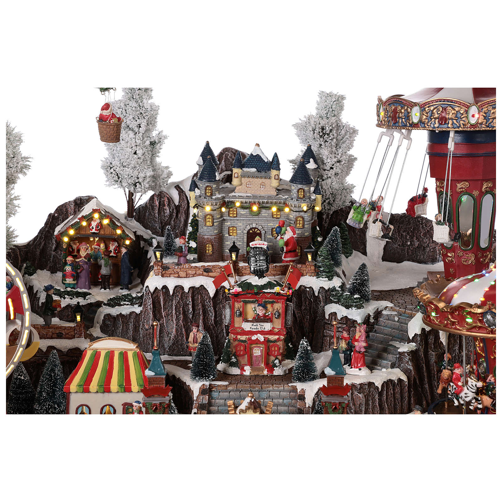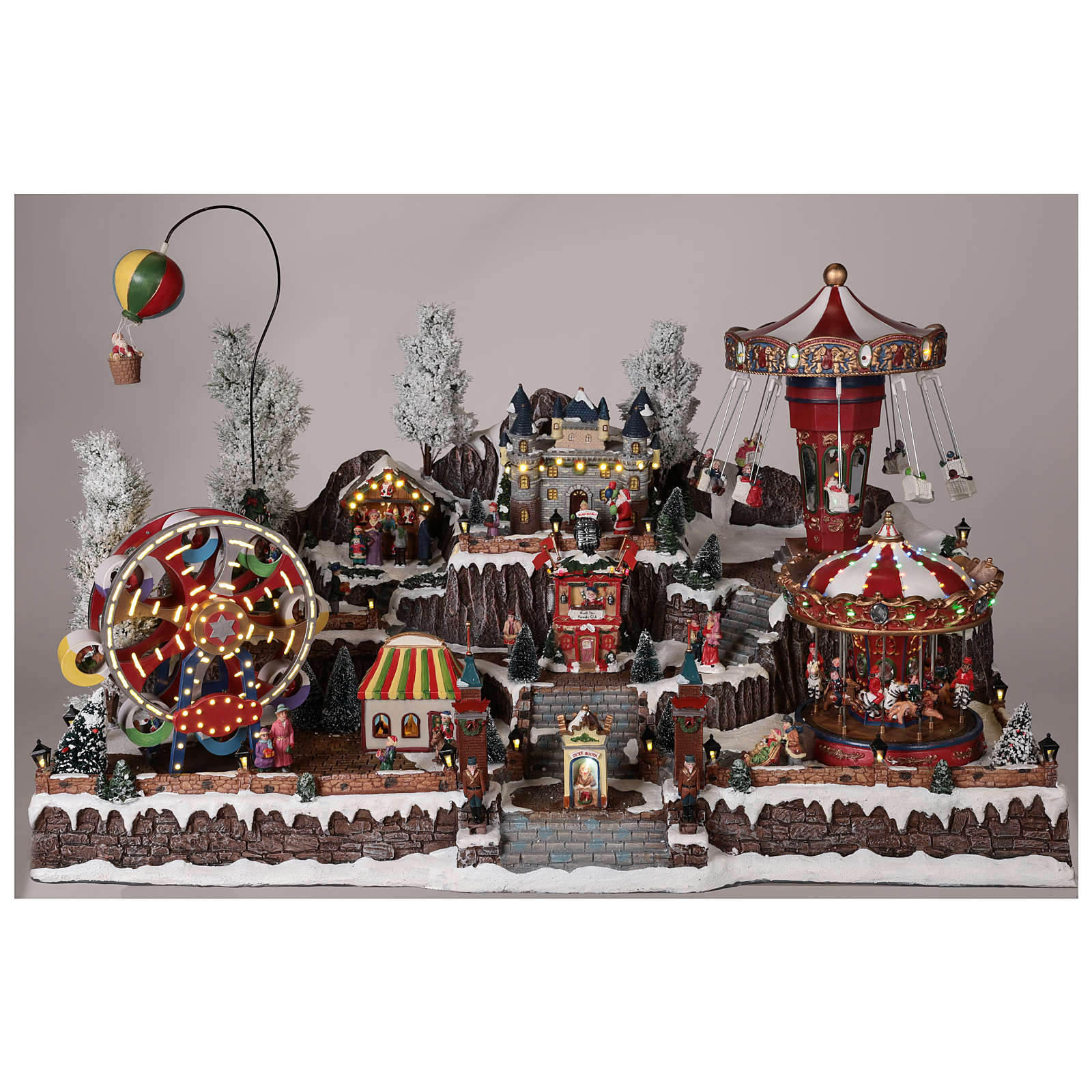 Magnífico cenário natalino em miniatura com um pequeno castelo no topo, uma roda gigante com movimento no lado esquerdo e um carrossel e outro brinquedo de parque de diversão no lado direito, também com movimento. Este lindo cenário de Natal é decorado por muitas outras figuras de estilo natalino, entre as quais Pai Natal sobre um balão de ar quente.Este artigo funciona com corrente eléctrica 220V e tem ficha europeia. Mediante um interruptor o cenário pode ser animado com luzes, movimentos e música ou só com movimentos e luzes.