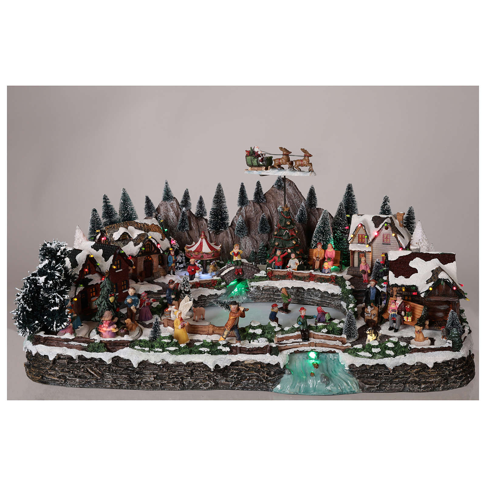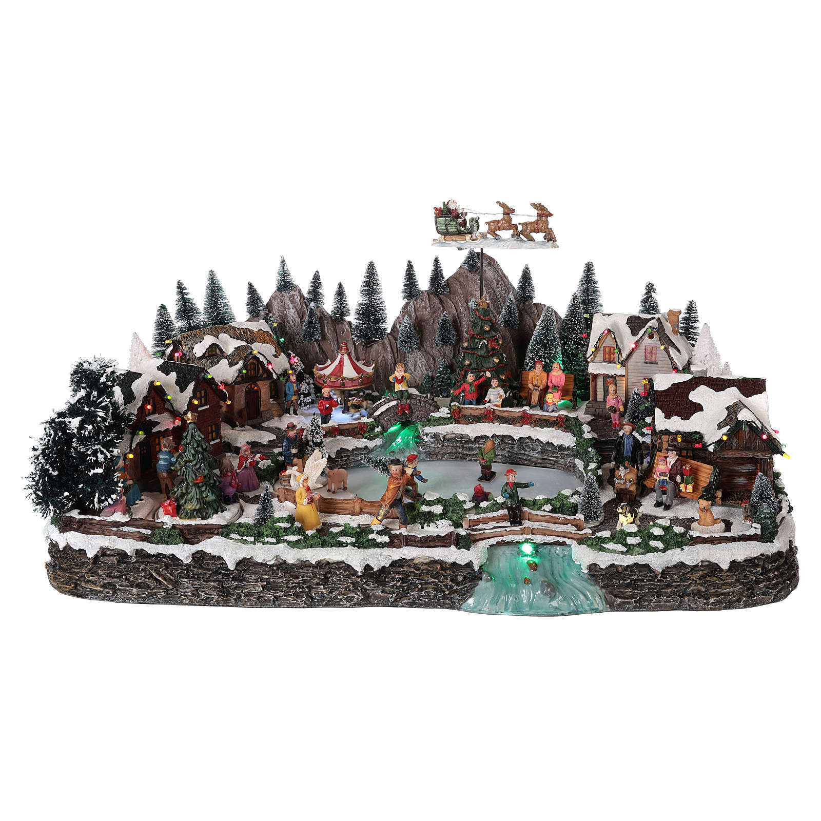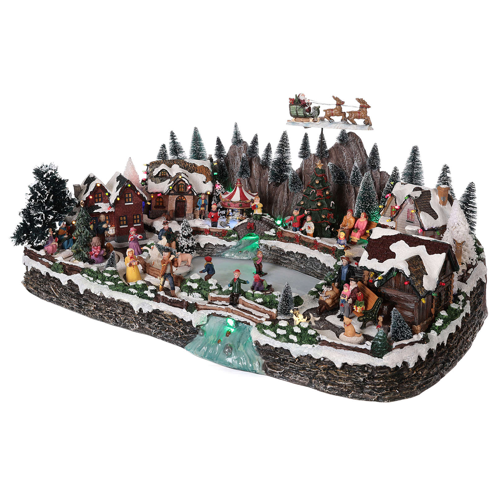 Magnífico cenário natalino em miniatura caraterizado por um lago gelado no centro com pequenas figuras patinando nele. Este lindo cenário de Natal é decorado por muitas outras figuras de estilo natalino, entre as quais um carrossel, meninos jogando a redor de uma árvore de Natal e Pai Natal voando no seu trenó.Este artigo funciona com corrente eléctrica 220V e tem ficha europeia. Mediante um interruptor o cenário pode ser animado com luzes, movimentos e música ou só com movimentos e luzes.