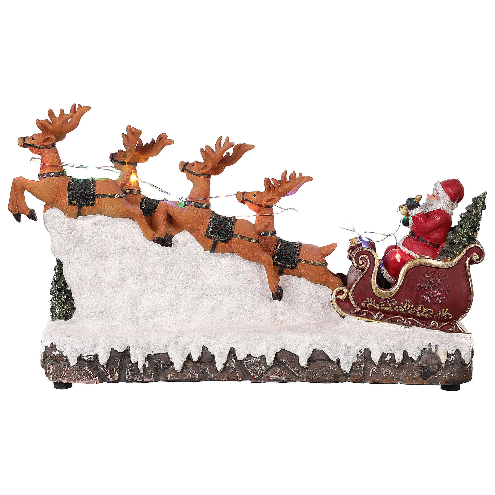 Cenário natalio trenô de Pai Natal com renas luzes música 25x40x10 cm. Cenário de Natal com trenê de Pai Natal e renas numa paisagem nevada.Cenário alimentado por pilhas.A música pode ou não ser activada no mesmo tempo que as luzes e os movimentos.