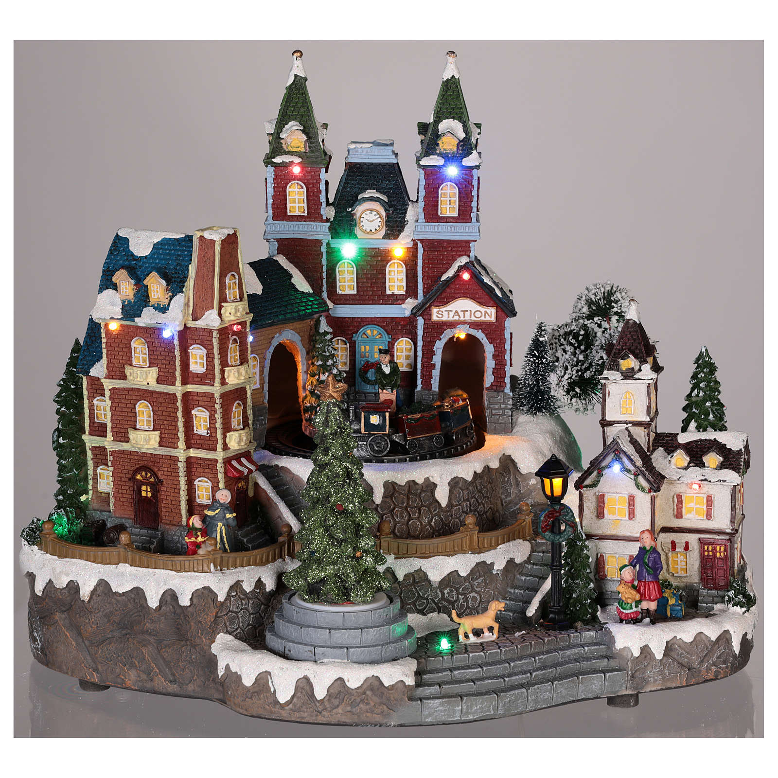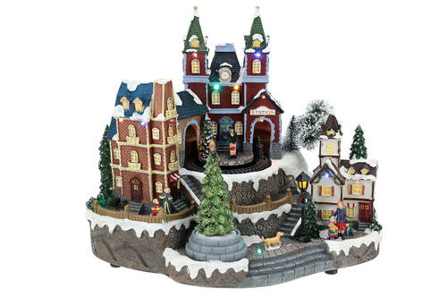 Estação de trem decorada por Natal 30x35x25 cm. Este cenário de Natal em resina adapta-se a qualquer espaço e é compatível