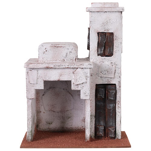 Casa em miniatura estilo palestino com estábulo para presépio com figuras altura média 11 cm, medidas: 31x24x17 cm.Casa em miniatura de estilo palestino com estábulo lateral, cúpula, porta e janelas de madeira. Artigo realizado em madeira e poliestireno.Cenário adequado para um presépio com figuras de altura média 10-11 cm (altura de uma figura humana adulta de pé).Medidas: 31x24x17 cm aproximadamente. Altura da porta: 12,5 cm
