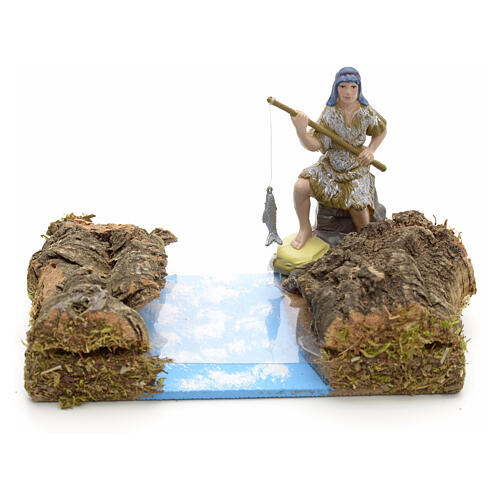 Pescador com vara para presépio de 8 cm. Figura de pescador com trecho de rio, inteiramente realizado na Itália.