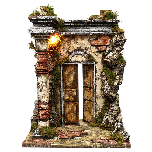 Templo em alvenaria com luz 50x40x30 cm para presépio com figuras de 10 cm de altura média. Cenário com templo com coluna em alvenaria, porta meio aberta e musgo, equipado com iluminação alimentada por ficha 220V.