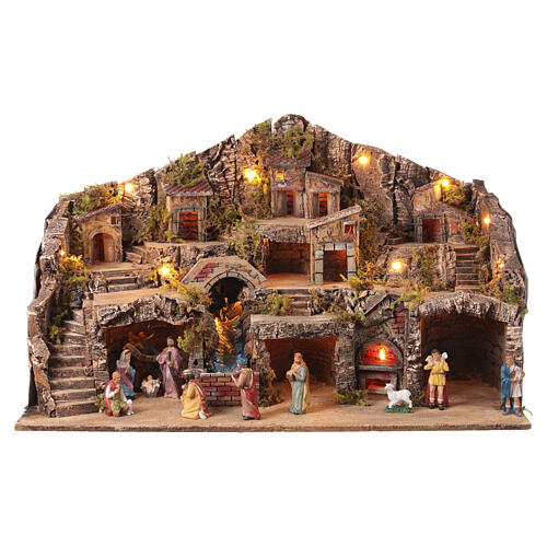 A cena inclui 11 estatuetas em resina, com até 10 cm de altura, representando a Sagrada Família e um anjo dentro da manjedoura; do lado de fora, há os Reis Magos e pastores em adoração. A cena dispõe de três fichas elétricas de duas pinas italianas: uma para as luzes que contornam a cena, outra para o forno com luz tremulante simulando um fogo e a terceira para ativar a cascata com uma bomba de água integrada.