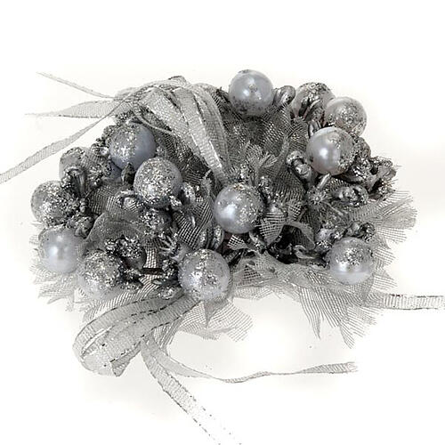Coroa decorativa para vela de Natal adequada para velas e círios de diâmetro máximo de 3 cm, composta por folhas, bagas e laços prateados cobertos com glíter prateado.