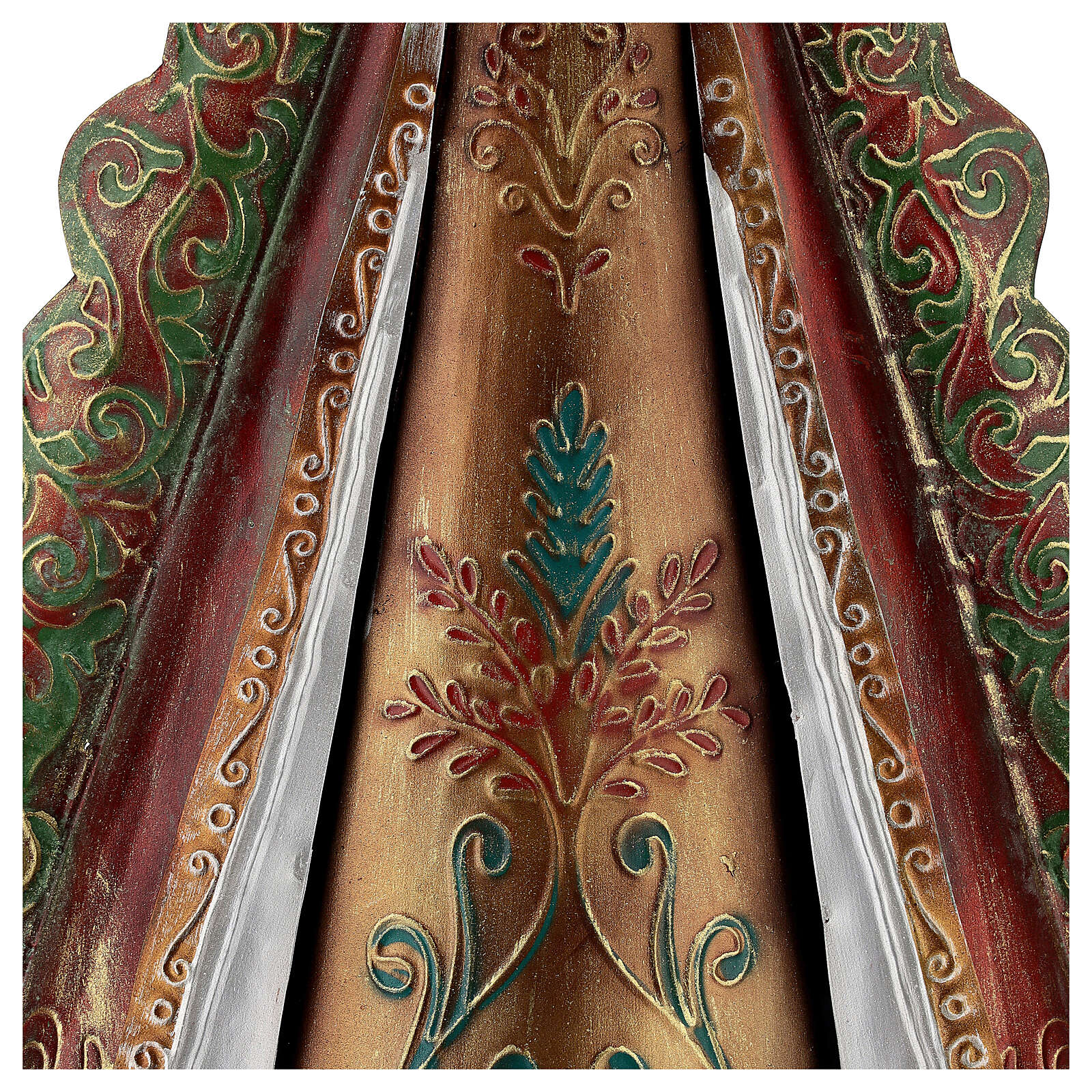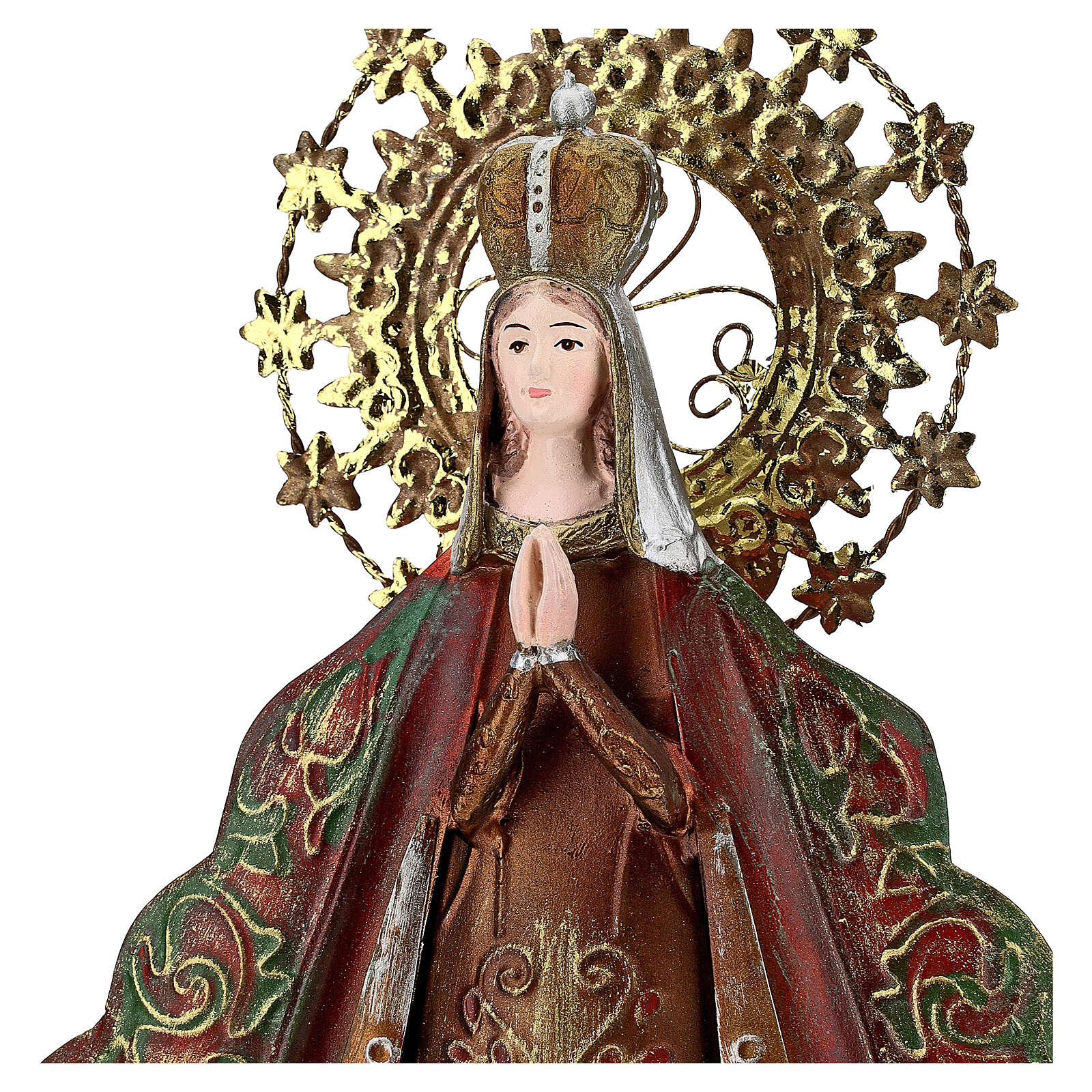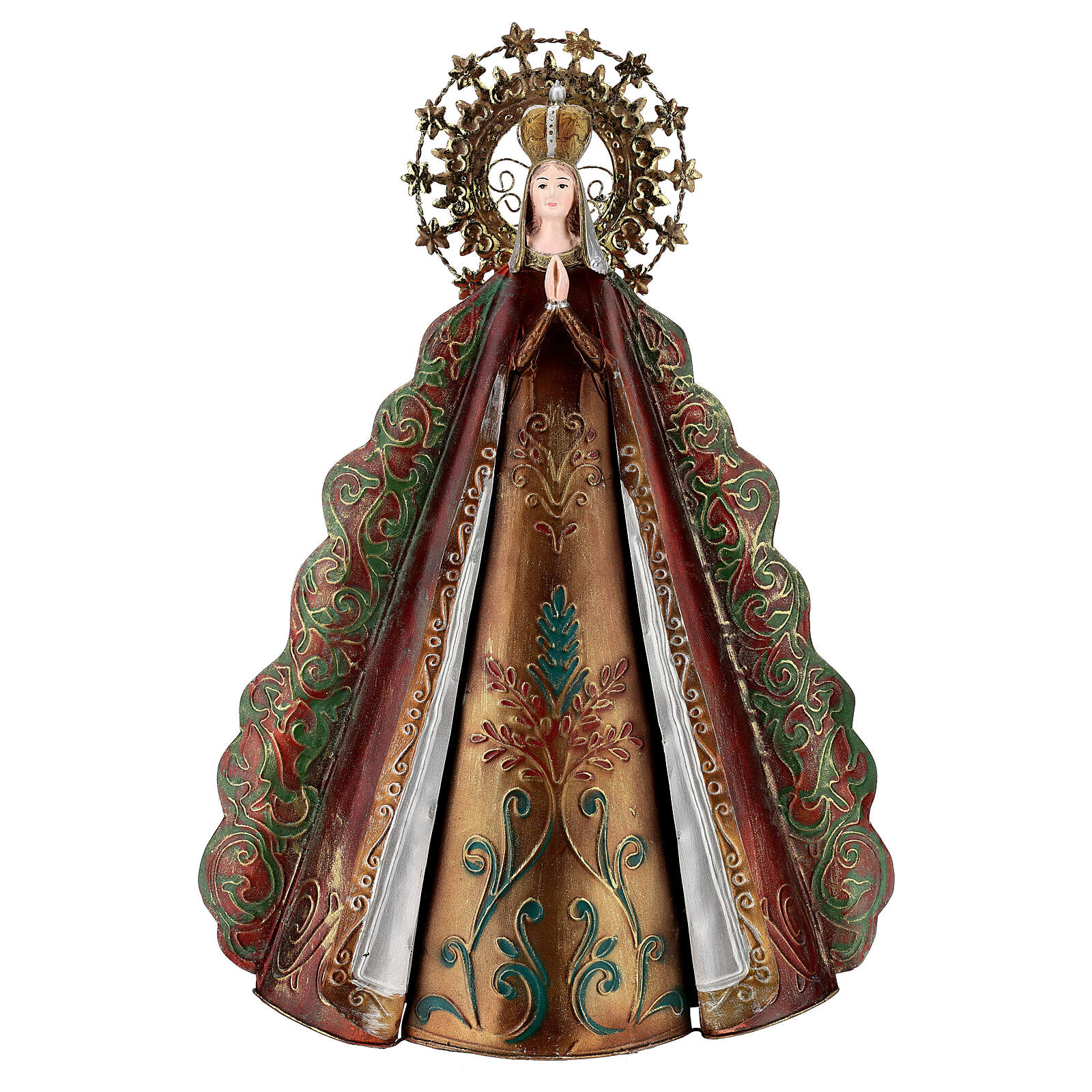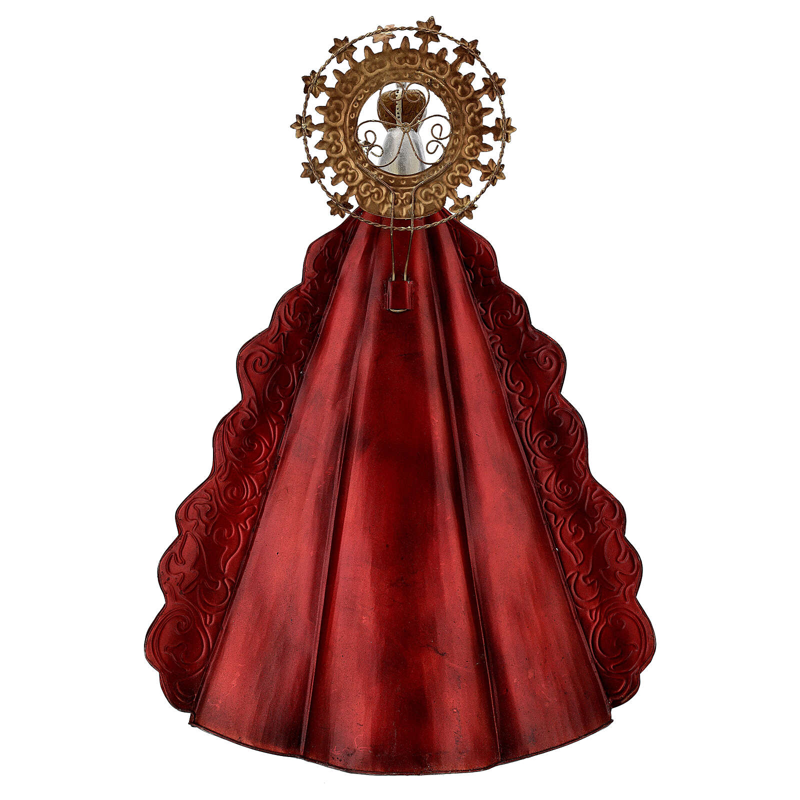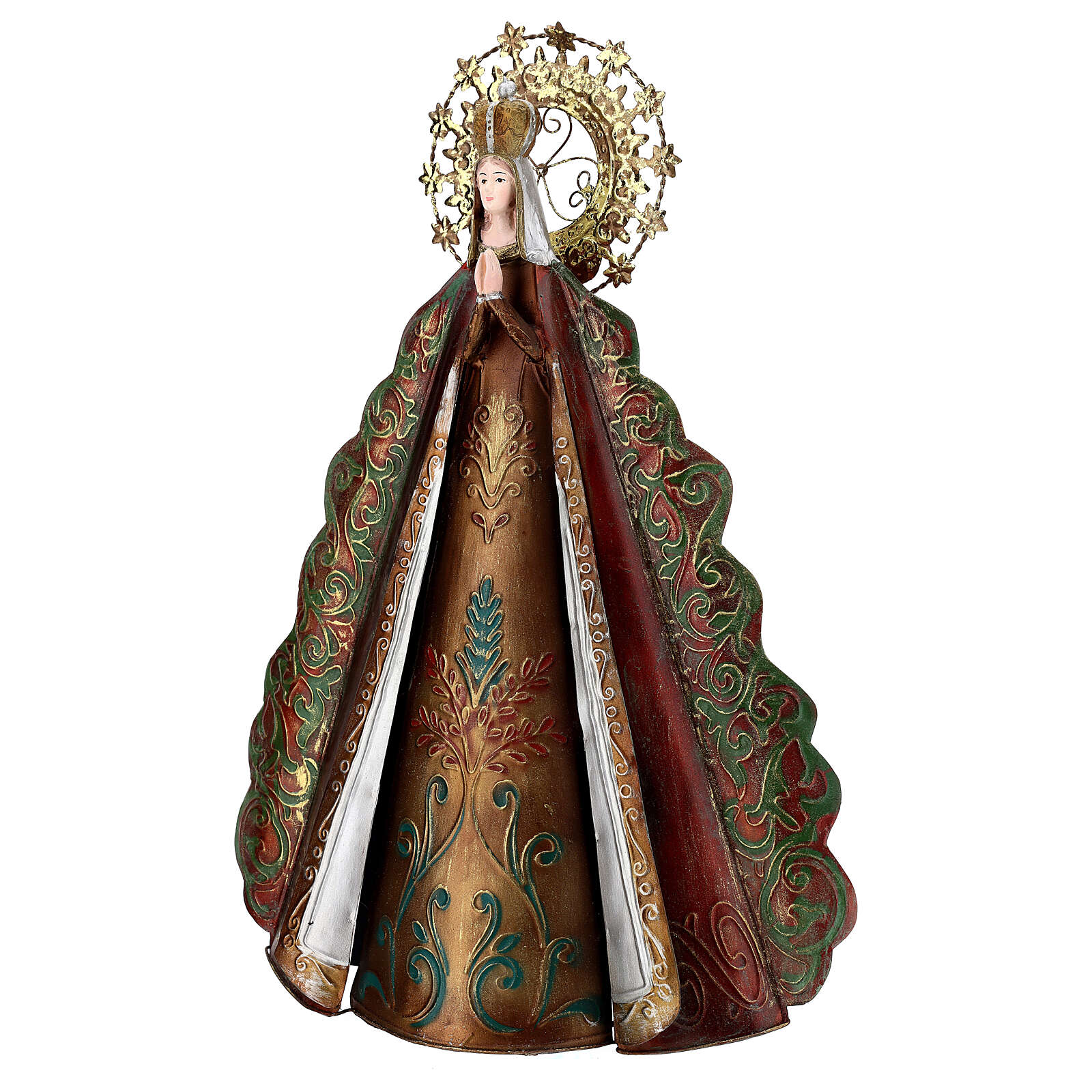 Imagem Nossa Senhora com auréola de estrelas e coroa metal, altura 51 cm.Elegante imagem de Nossa Senhora representada com as mãos juntas, a coroa de rainha do Céu e uma auréola de estrelas.A imagem é realizada em metal e mede: 51x35x16 cm.