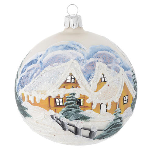 Adorno de Natal bola vidro paisagem decoupagem 100 mm. Bola de Natal de 100 mm em vidro soprado com paisagem de inverno realizada com técnica mista de pintura e decoupagem. Produto de fabricação inteiramente artesanal, realizado na Polónia.