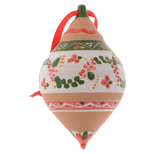 Bola de Natal dupla ponta terracota 120 mm. Bola de Natal com dupla ponta, realizada em terracota e pintada à mão com cores quentes e motivo de galhos entrelaçados.