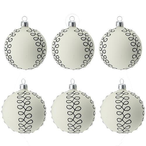 Bolas árvore de Natal vidro soprado branco com arabescos pretos e glitter dourado 80 mm 6 unidades