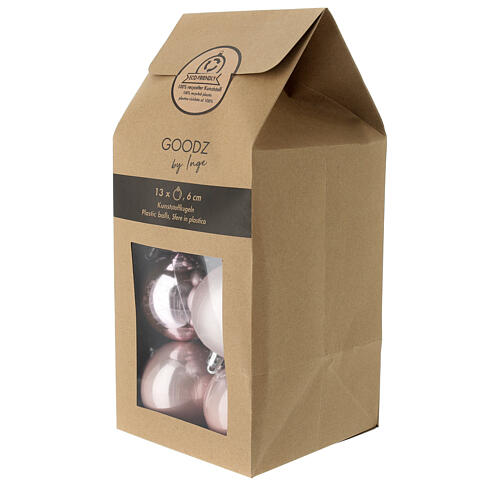 Bolas de Natal cor-de-rosa plástico reciclado 60 mm conjunto 13 peças. Embalagem de papelão reciclado com 13 bolas de Natal de plástico 100% reciclado, resistente a fraturas, cor-de-rosa com acabamento opaco ou brilhante e 13 cordas prateadas para pendurá-las na árvore de Natal.
