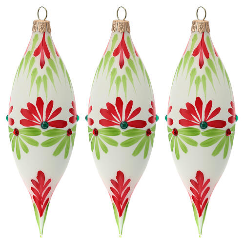Bolas de Natal ponta dupla vidro soprado verde e vermelho 130 mm caixa de 3. Conjunto de 3 bolas de Natal de 130 mm com ponta dupla, em vidro soprado, pintadas à mão com motivos verdes e vermelhos sobre fundo branco.