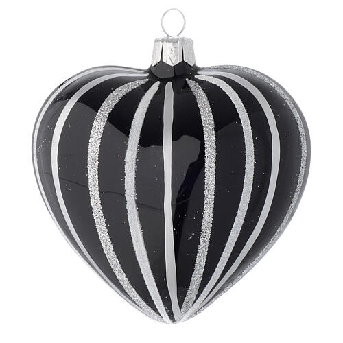 Coração em vidro preto riscas prata 100 mm. Bola de Natal em vidro preto com riscas cor de prata de 100 mm de diâmetro, realizada em forma de coração. Adorno para árvore de Natal produzido de forma artesanal em vidro soprado pintado à mão na Polónia.