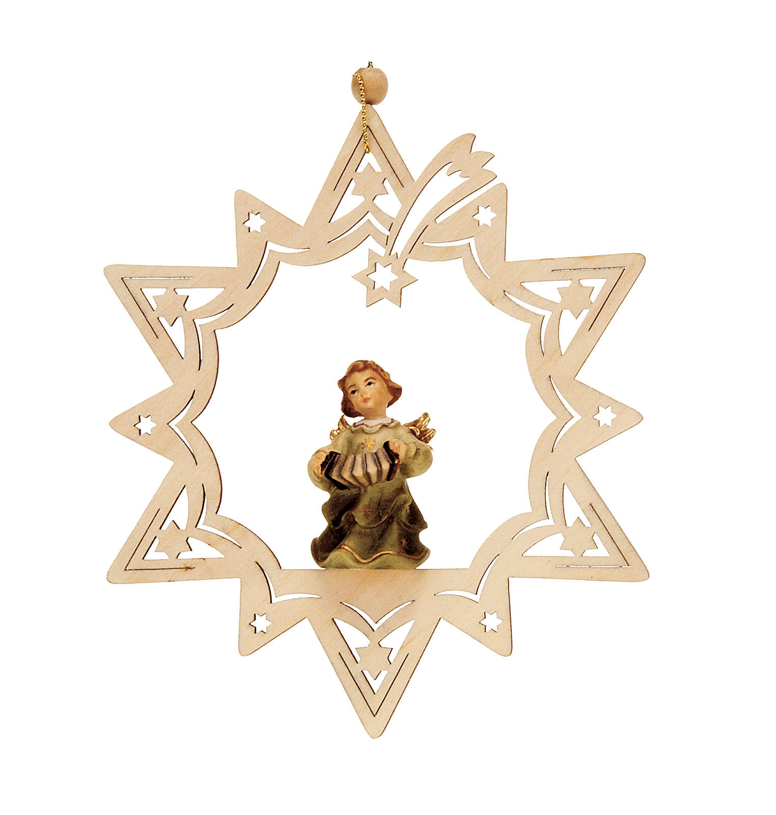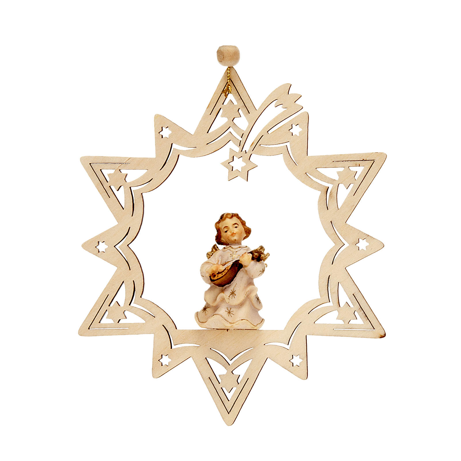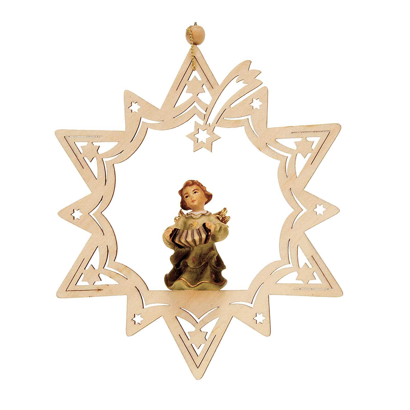 Anjinho músico estrela. Adorno para árvore de Natal em forma de estrela com anjo músico, realizado em madeira e pintado à mão.