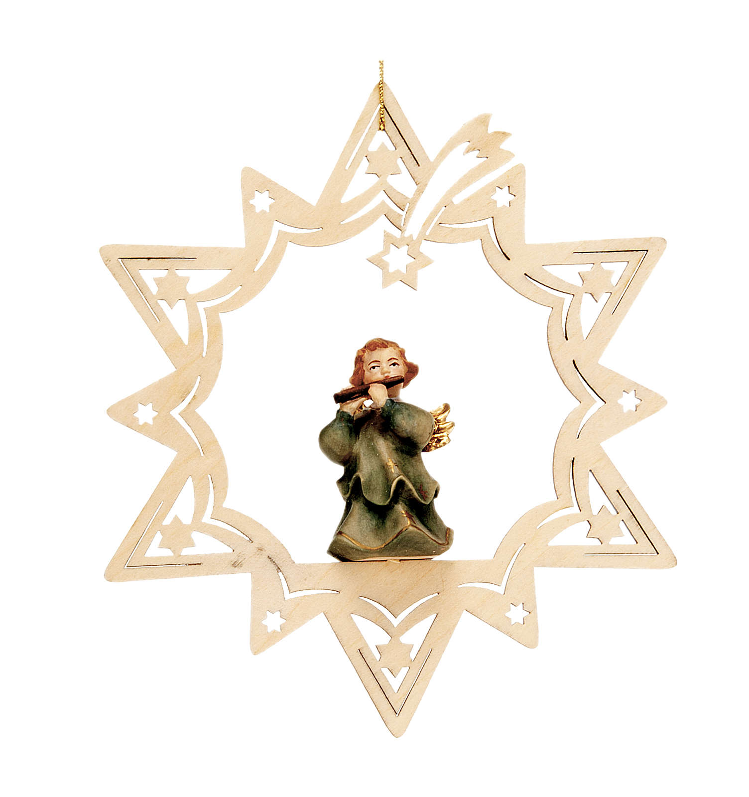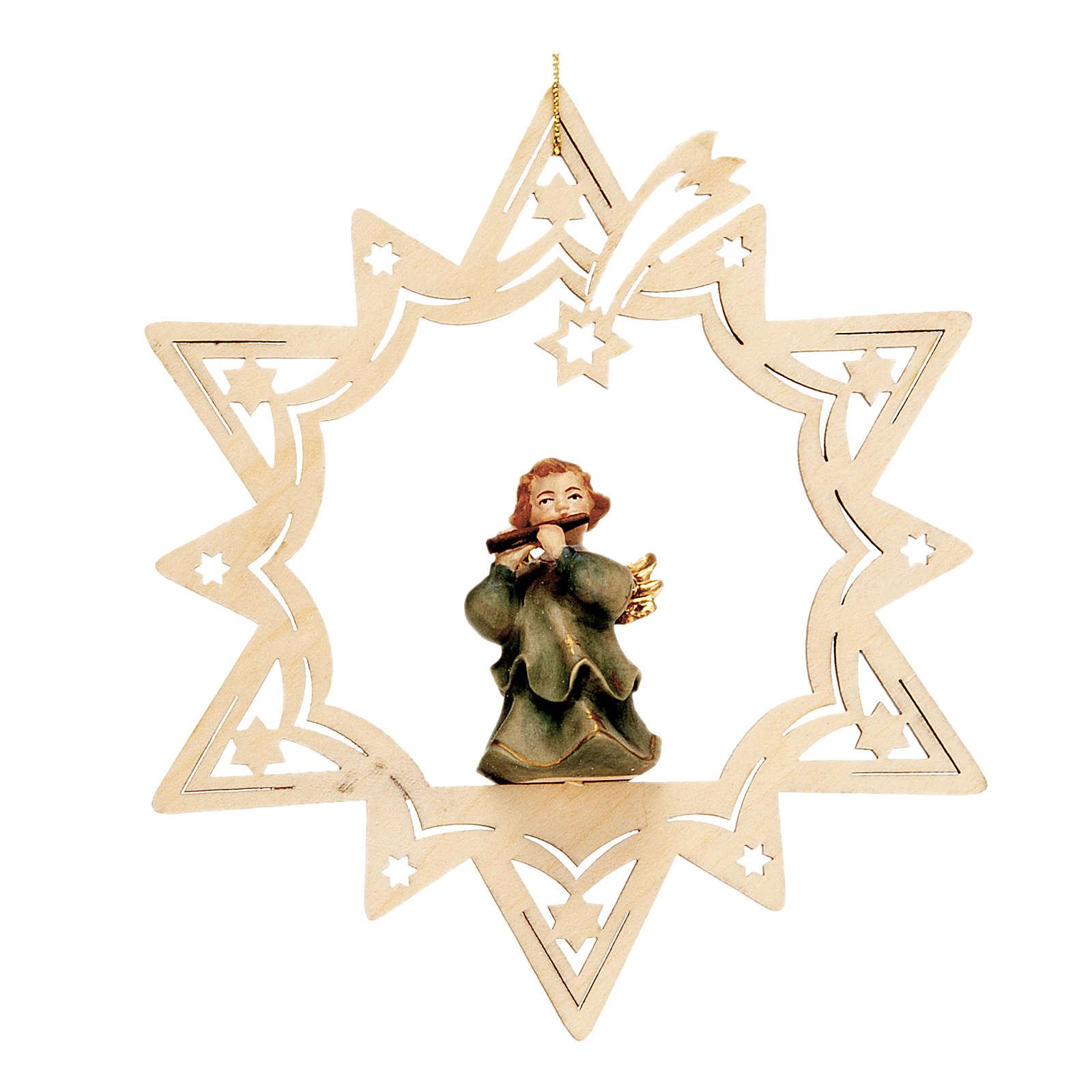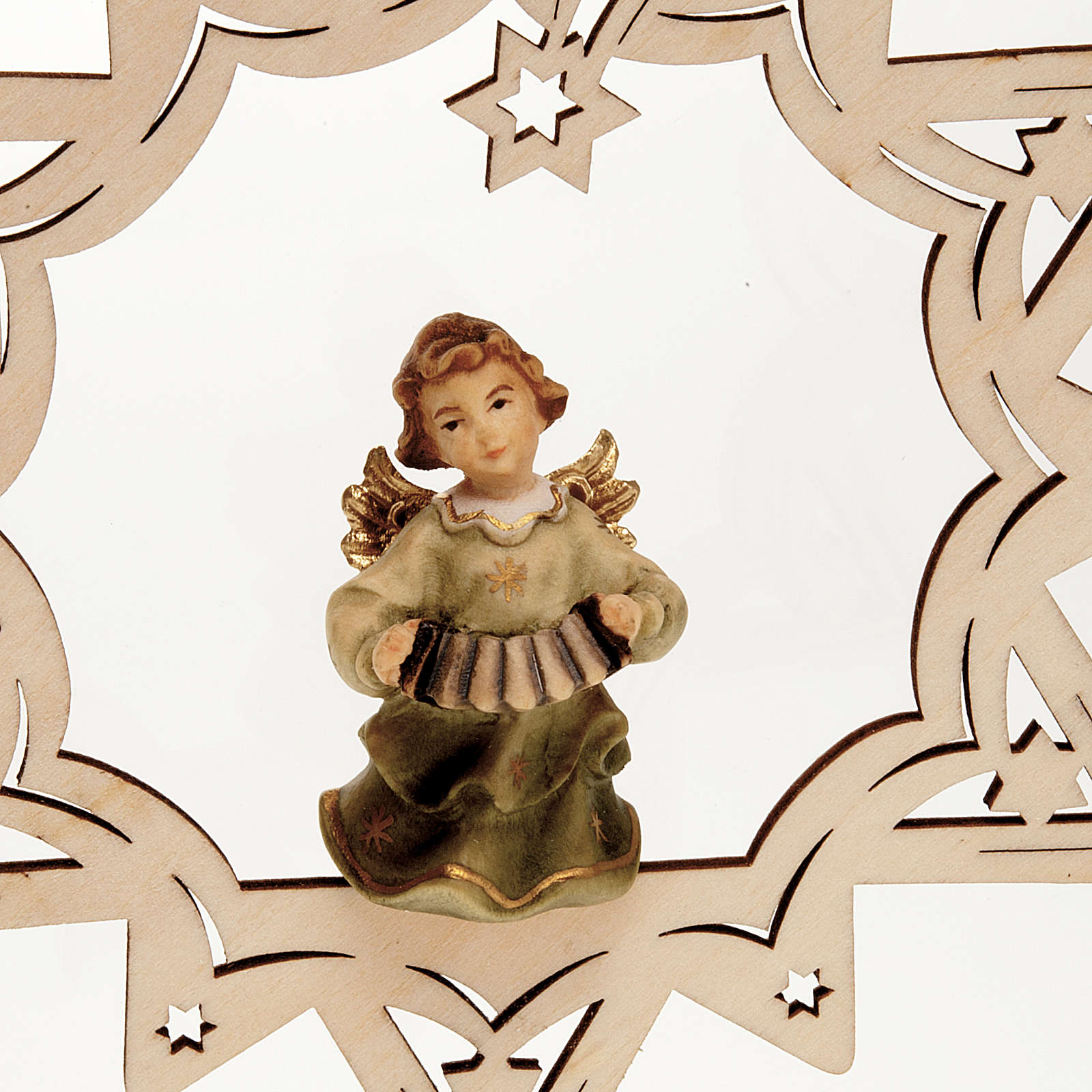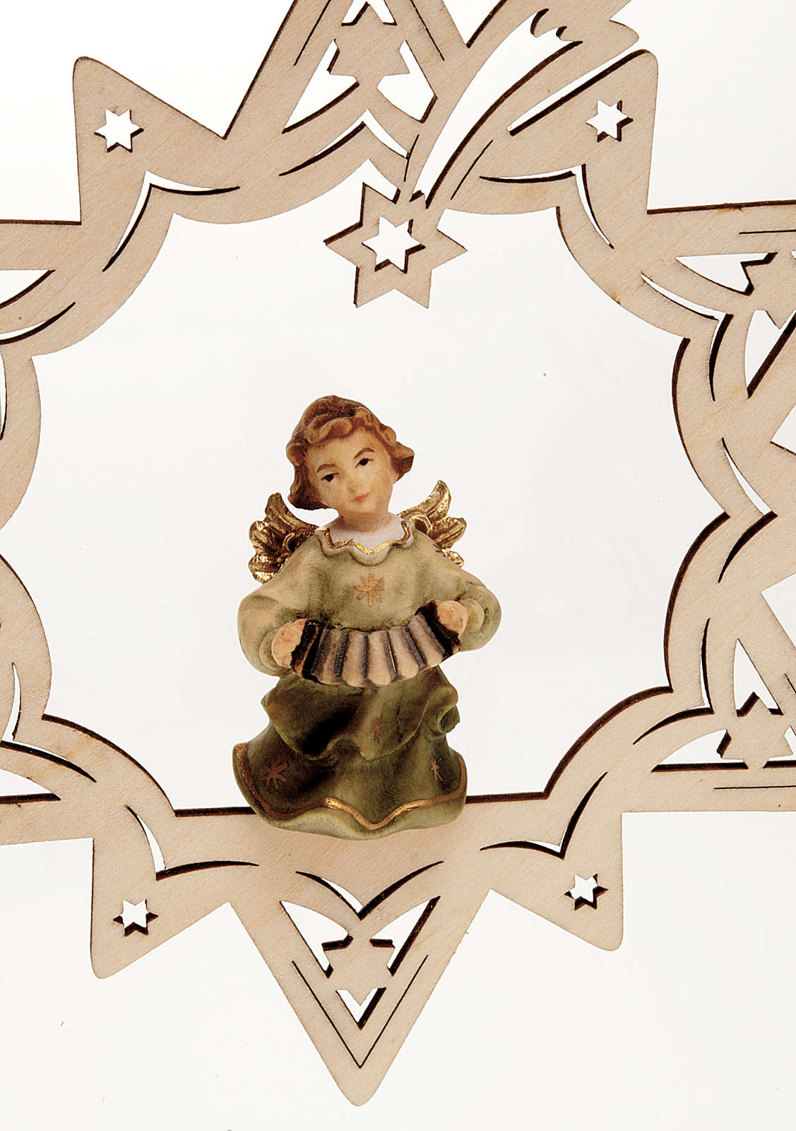 Anjinho músico estrela. Adorno para árvore de Natal em forma de estrela com anjo músico, realizado em madeira e pintado à mão.