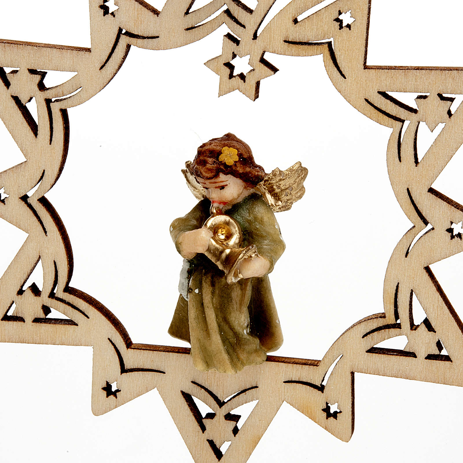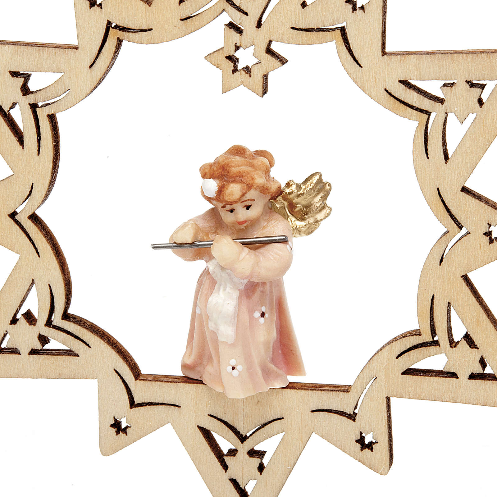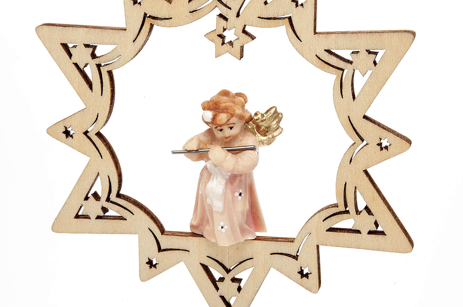 Anjinho na estrela. Adorno para árvore de Natal com anjo músico numa estrela, realizado em madeira e pintado à mão. A estrela é decorada com uma cometa e estrelinhas.