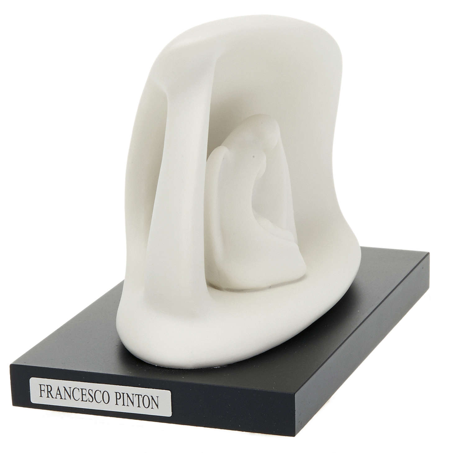 Natividade estilizada cabana. Natividade estilizada com cabana em porcelana branca sobre base em madeira pintada preta com assinatura de Francesco Pinton na borda e no verso da base.