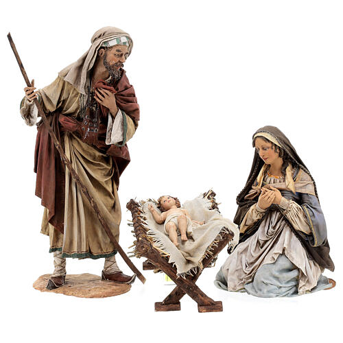 Maravilhoso grupo da Sagrada Família realizado pela artista siciliana Angela Tripi. O grupo inclui o Menino Jesus no berço, a Virgem Maria e São José e é adequada para um presépio com figuras de altura média 30 cm (altura de uma figura humana de pé), mas é perfeita também como obra de arte de si mesma.Cada imagem da mestra da arte sacra Angela Tripi é uma peça única, uma obra de arte feita em terracota modelada à mão, com grande cuidado em todos os detalhes, e roupas em verdadeiro tecido, para criar um efeito de realismo excepcional. Os rostos e os corpos são capazes de expressar emoções quase como fossem vivos e nestas obras é possível admirar verdadeiramente o mistério das cenas sacras que representam.Sendo uma obra inteiramente artesanal, cada imagem é única e irrepetível.