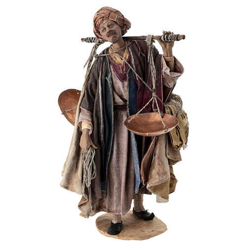 Vendedor com balança 30 cm Angela Tripi terracota. Peça para presépio de mercador com balança em terracota de 30 cm. Esta figura é representada chamando a atenção dos clientes, com a boca entreaberta, pronta para gritar. Com os braços, balança o peso que tem no ombro, os músculos tesos e a mão apertada à haste. Avança rapidamente e percorre com confiança as vias do mercado.