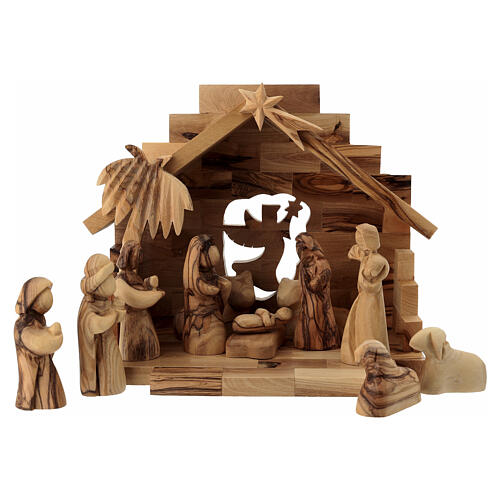 Cabana com presépio em oliveira de Belém com palmeira e cometa 20x20x15 cm. Cabana com presépio de 12 peças de uma altura média de 8 cm, inteiramente esculpida em madeira de oliveira por artesãos experientes da Terra Santa.Cada peça é uma obra de artesanato única e diferente.