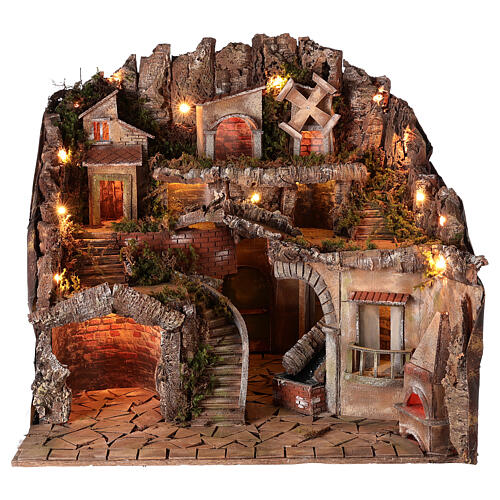 Aldeia rústica movimento moinho para presépio napolitano de 8 cm. Aldeia rústica manufacturada em Nápoles e adequada por peças de 8 cm de altura.As luzes e o movimento do moinho são alimentados por fichas eléctricas 220V.