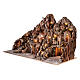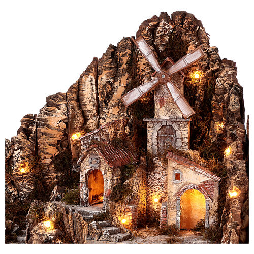 Presépio com 2 módulos ribeira moinho luzes para figuras de 8-10 cm de altura 69x117x50 cm. Cenário de presépio composto por 2 módulos, representando duas montanhas com casas e vegetação. Ambos os módulos são caracterizados por uma grande gruta na parte inferior, ideais pela cena da Natividade com figuras de 12 cm de altura, e por uma iluminação sugestiva. No módulo maior há também um moinho de vento, uma ribeira e um forno com efeito chama, alimentados pelas fichas no verso do cenário.