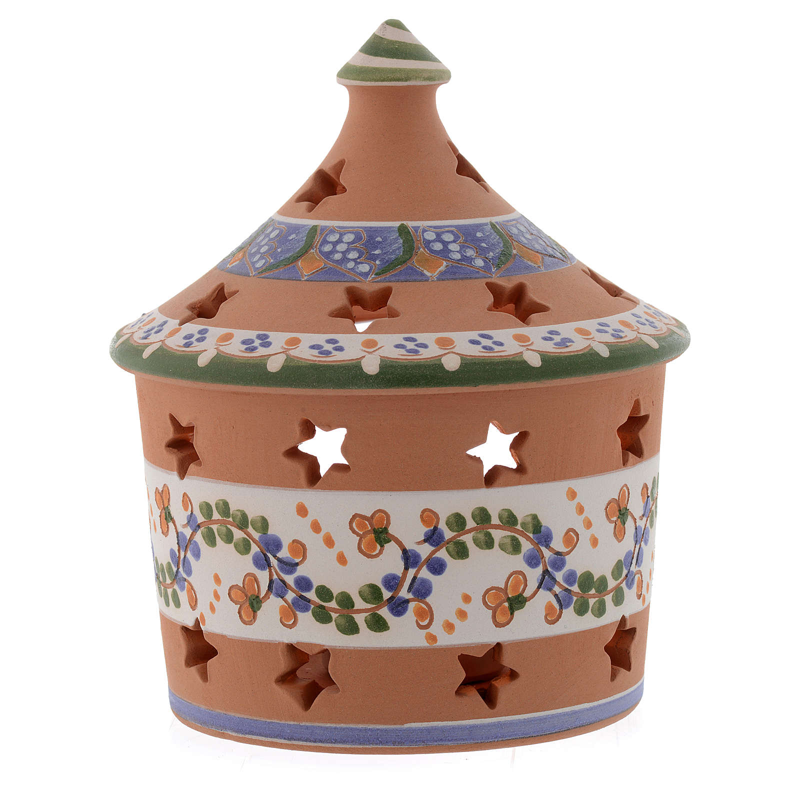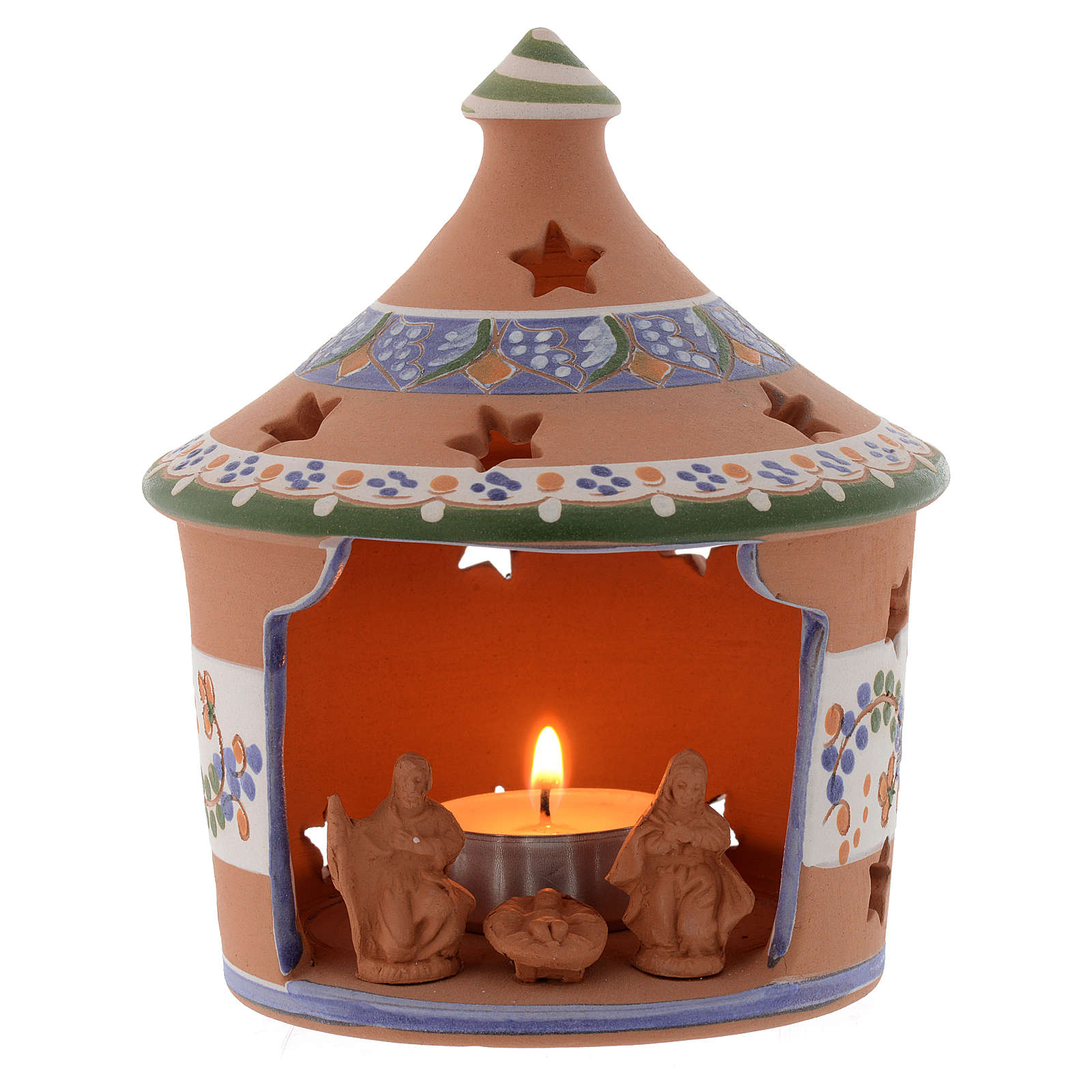 Lamparina para Natal cabana Natividade terracota Deruta 13 cm. Cabana com teto decorado com cores frias e motivos naturais e Natividade em miniatura com peças de 3,5 cm de altura média. Cabana lamparina em terracota para vela de 4 cm de diâmetro, realizada à mão em Deruta, aldeia italiana conhecida pelas obras em terracota.