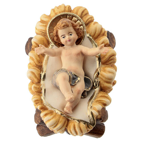 Menino Jesus com berço para presépio Mahlknecht de 12 cm em madeira pintada do Val Gardena. Figura de madeira de bordo, realizada e pintada à mão na Itália por uma empresa do Val Gardena especializada na realização de obras de arte em madeira esculpida.