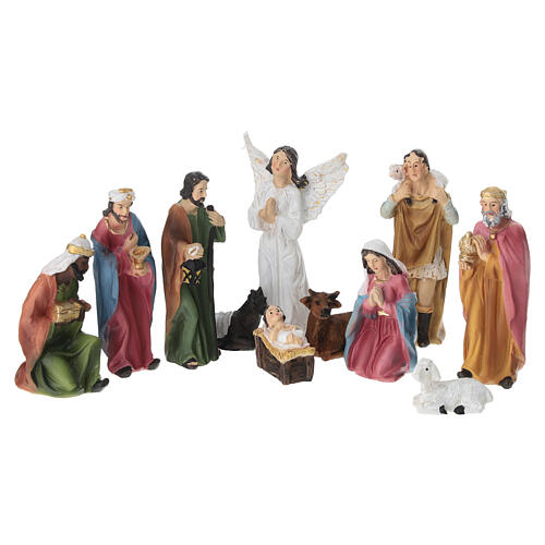 Peças moldadas em resina e pintadas à mão, com roupas tradicionais (mantos e túnicas) em várias cores e detalhes como presentes, bastões e asas do anjo.