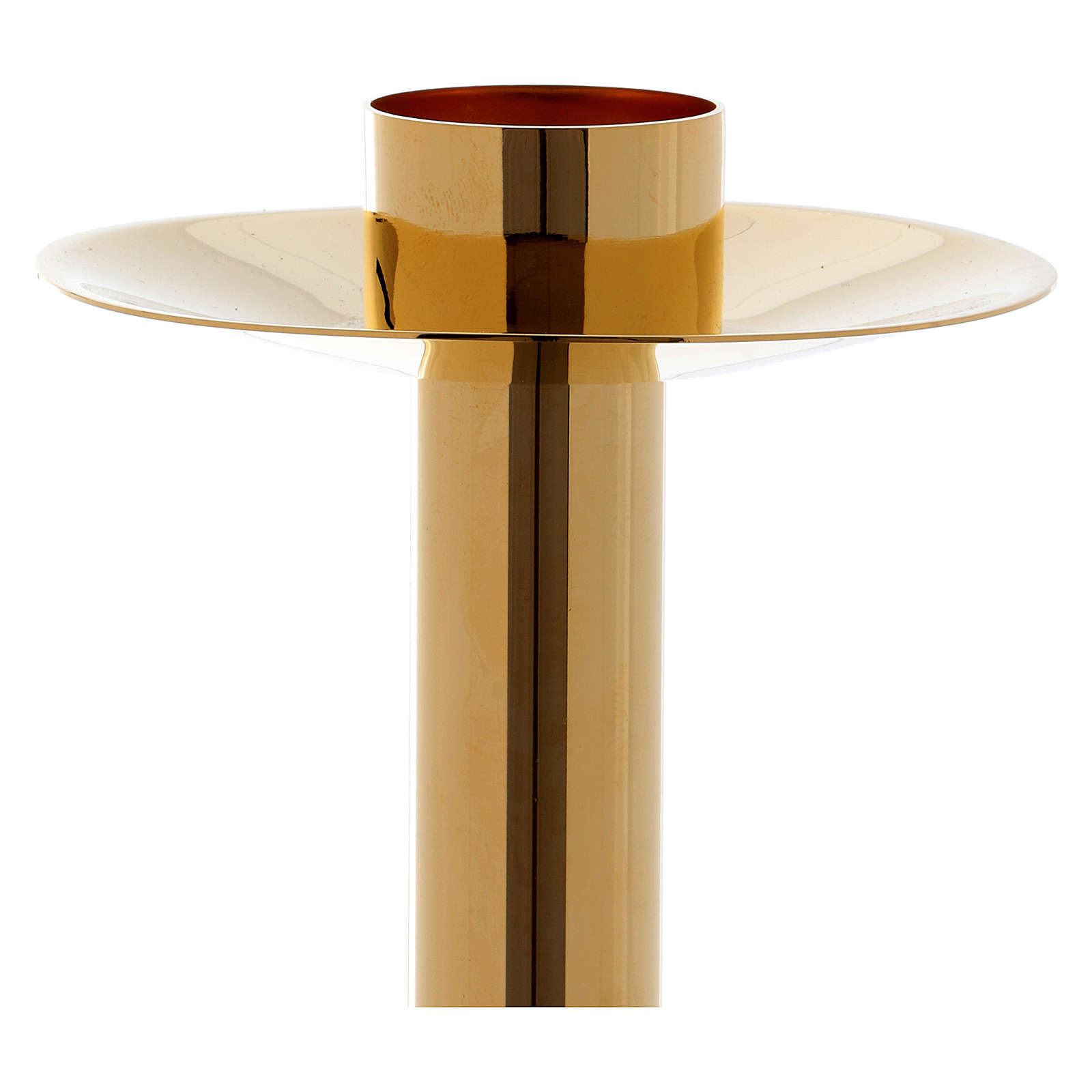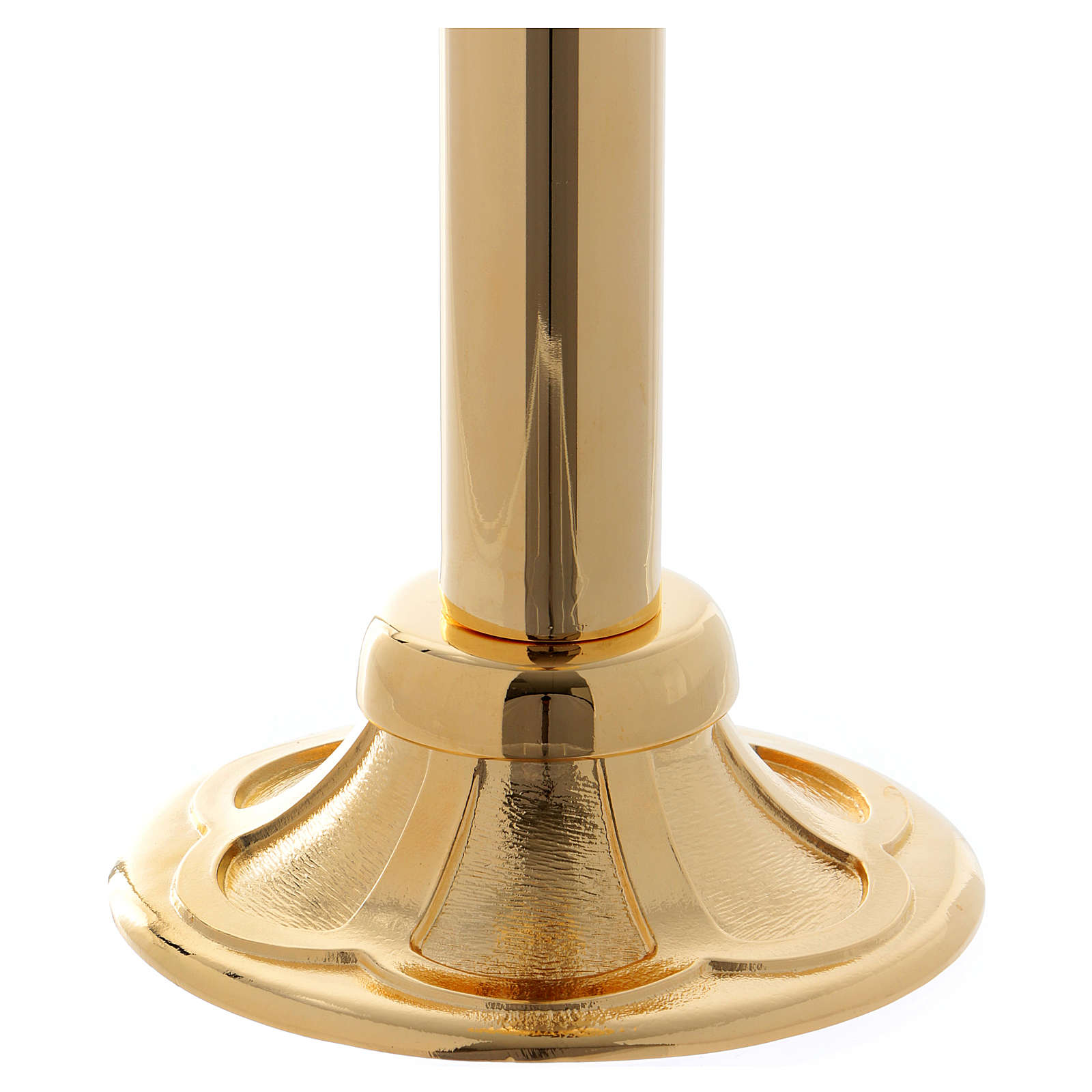 Dois castiçais realizados em latão dourado de altura 37,5 cm e com bocal de diâmetro 4 cm.