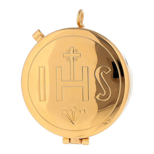 - Caixa de hóstias gravura IHS latão dourado 24 K diâmetro 5 cm