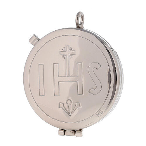 Linda caixa de hóstias de latão prateado com Cristograma IHS gravado.