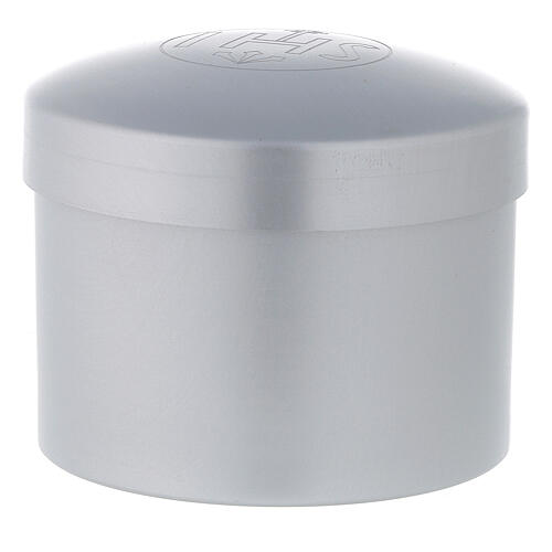 Caixa hóstias alumínio gravado 7x9 cm. Caixa para hóstias realizada em alumínio com gravura IHS na tampa.