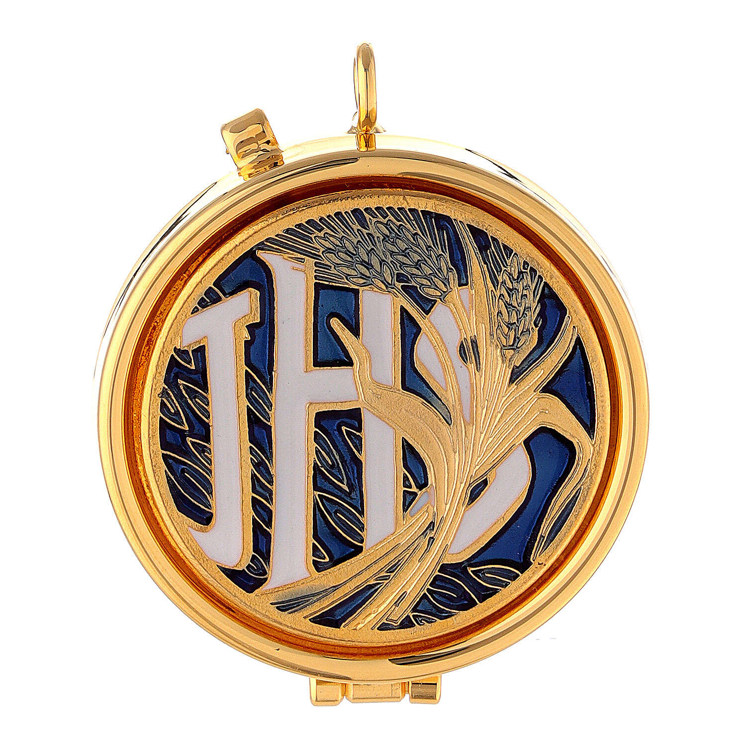 Caixa hóstias IHS trigo. Caixa de hóstias em latão dourado com decoro de IHS e trigo, pintado e esmaltado na tampa.