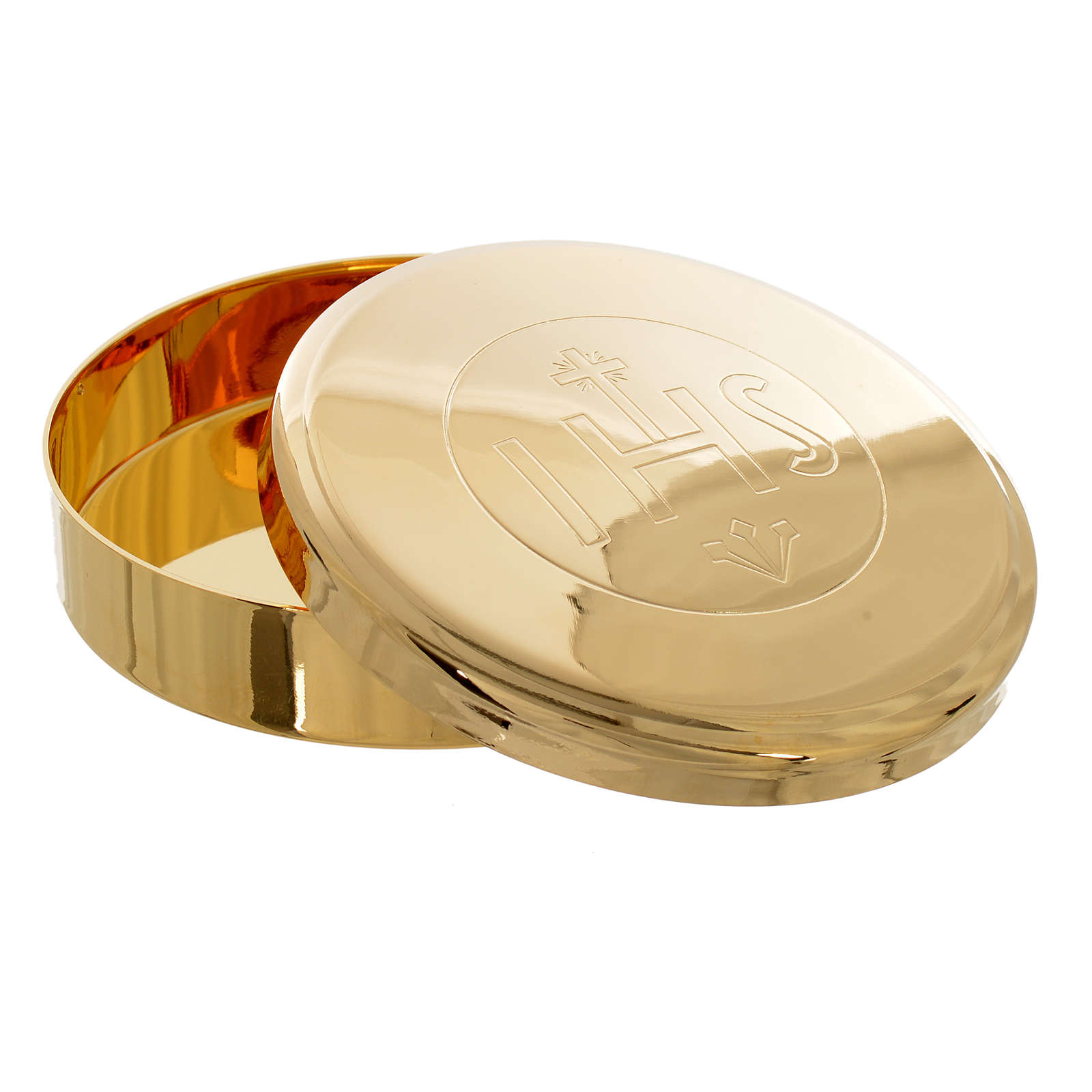 Caixa hóstias latão dourado IHS diâmetro 7 cm