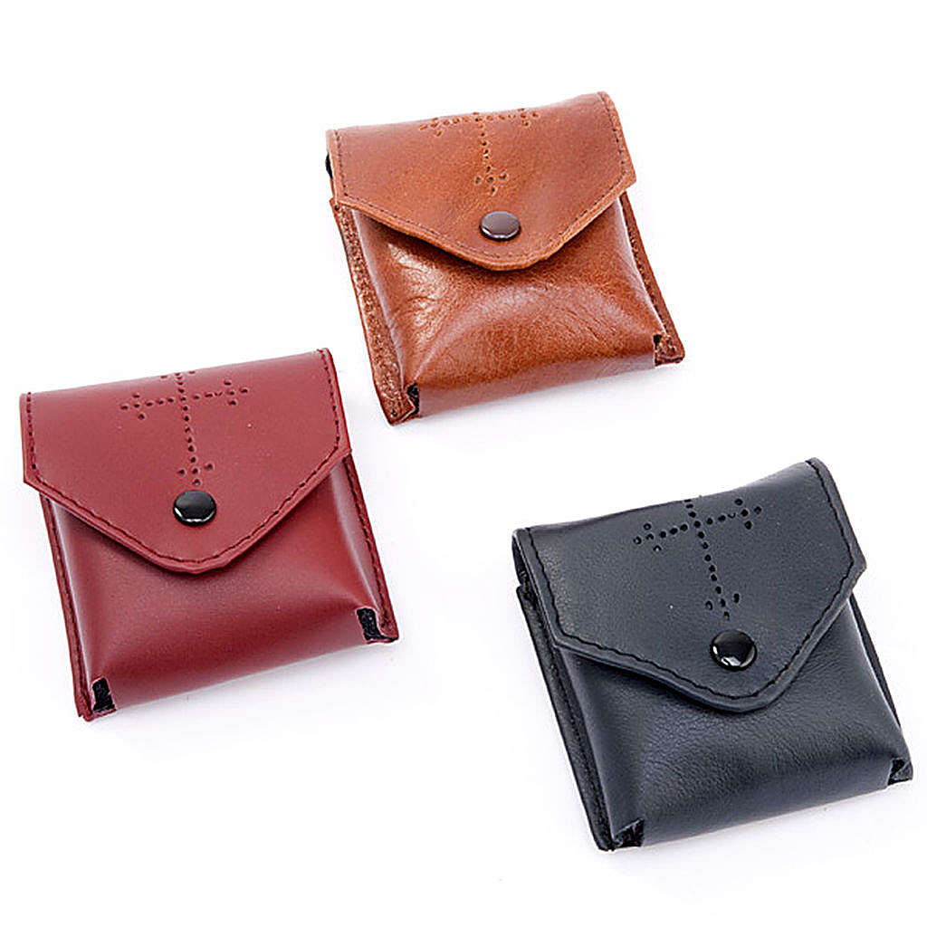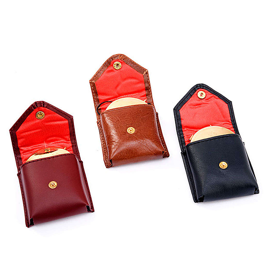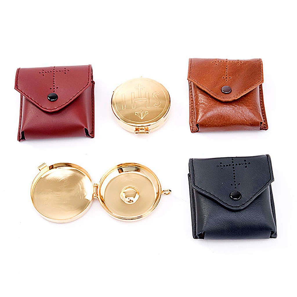 Estojo couro com caixa. Estojo pequeno em couro verdadeiro, realizado à mão, com caixa de hóstias em latão dourado, enriquecida por escrita IHS na tampa e fio para pendura-lo no pescoço.