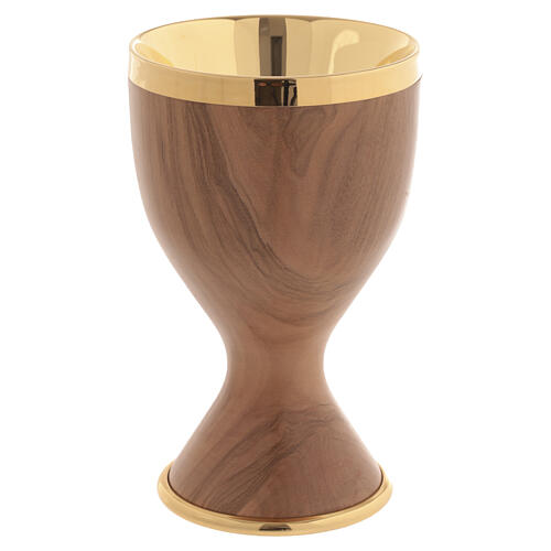 Cálice em oliveira com copa e base em metal acabamento dourado H 17 cm.