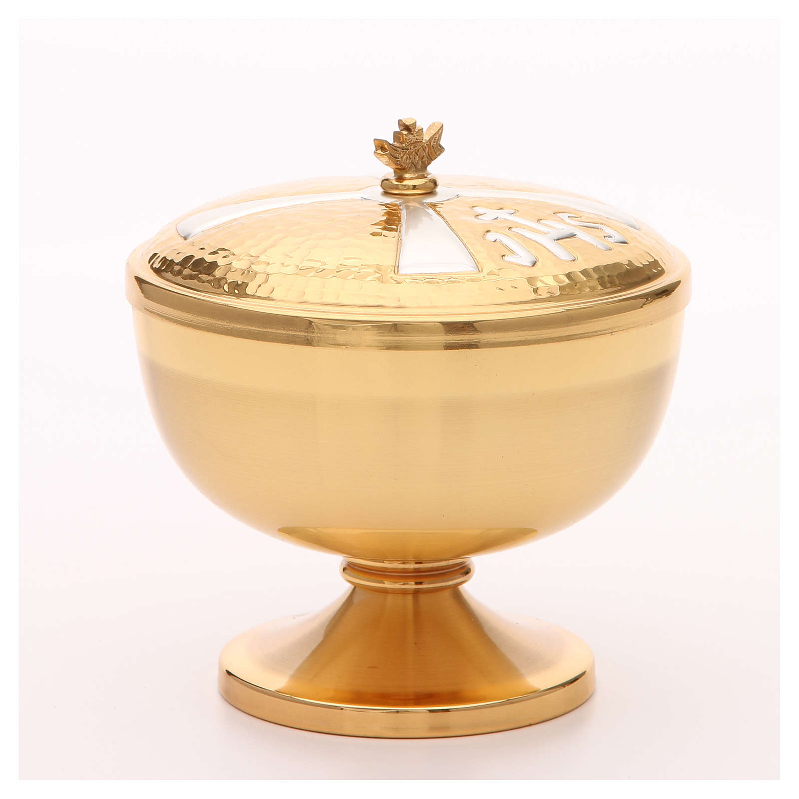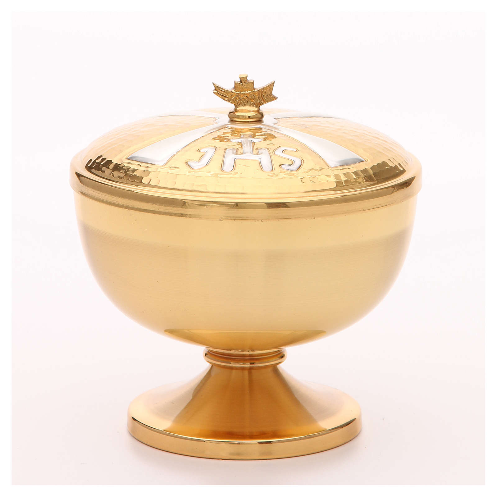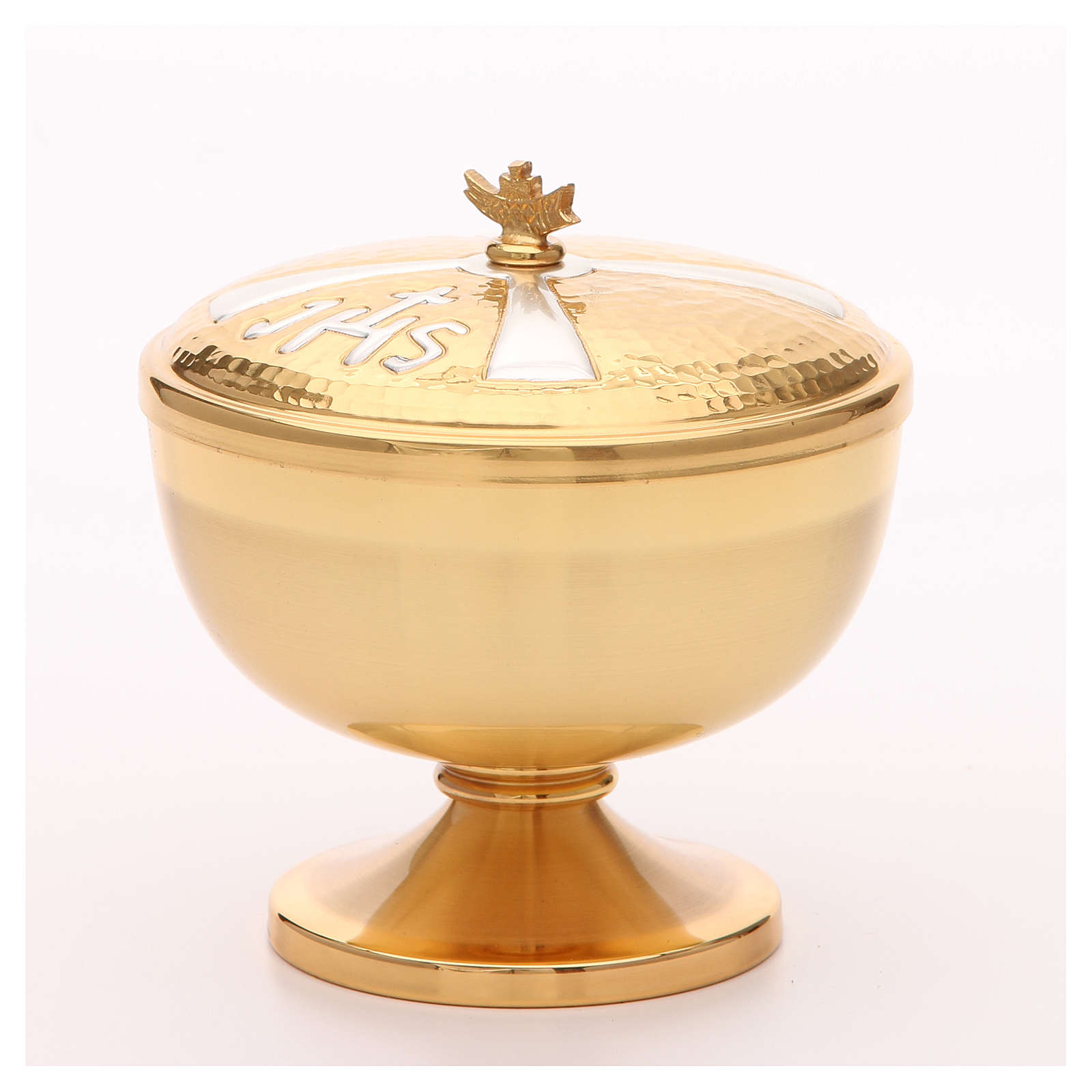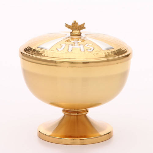 Âmbula IHS latão dourado. Píxide em latão dourado com símbolo IHS prateado na tampa.