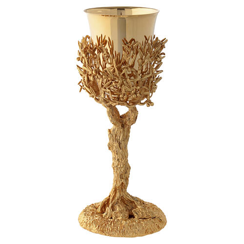 Cálice litúrgico em latão banhado a ouro 18 kt, decorado com um rico ornamento de ramos e folhas de oliveira realizados em microfundição, que envolvem a haste criando um efeito natural e simbólico.