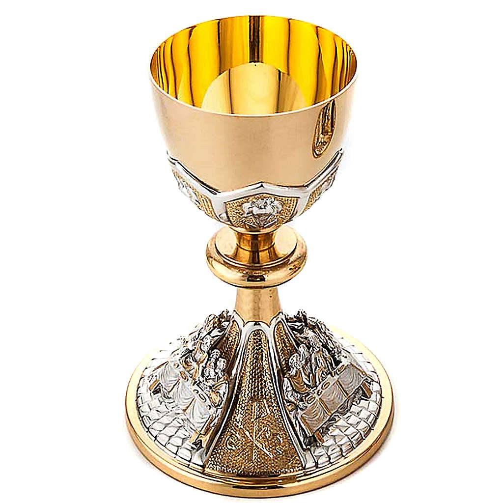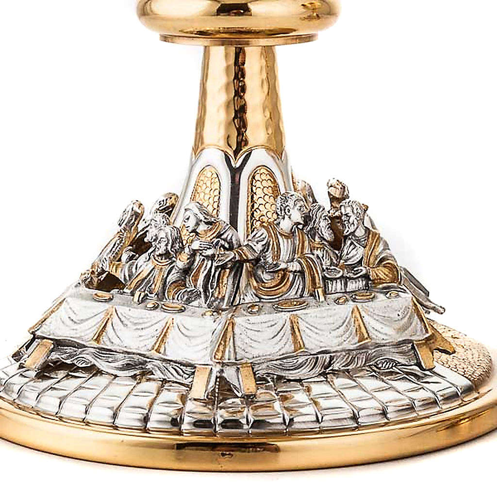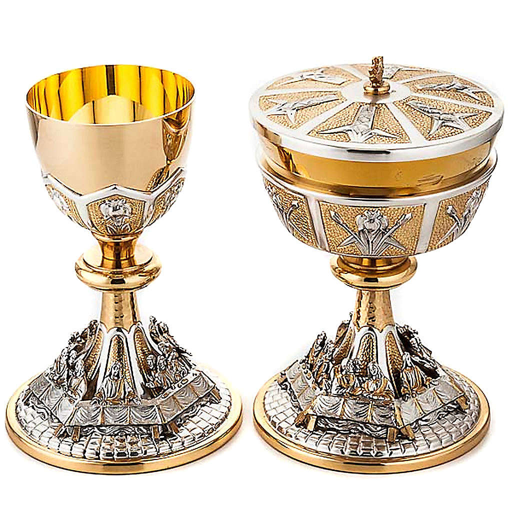 Cálice e âmbula cinzelados latão Última Ceia. Junto eucarístico composto por um cálice e uma píxide em latão bicolor com decoração da Última Ceia na base. A tampa da âmbula também é decorada.