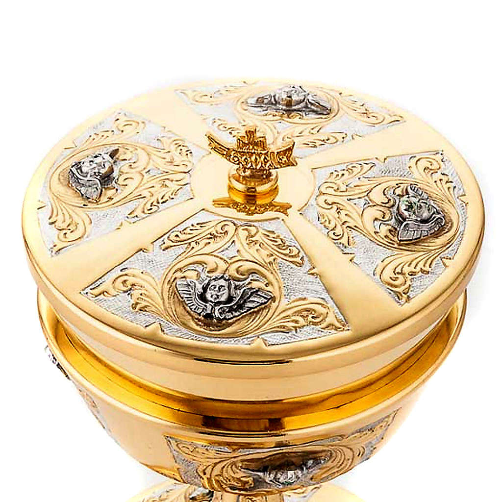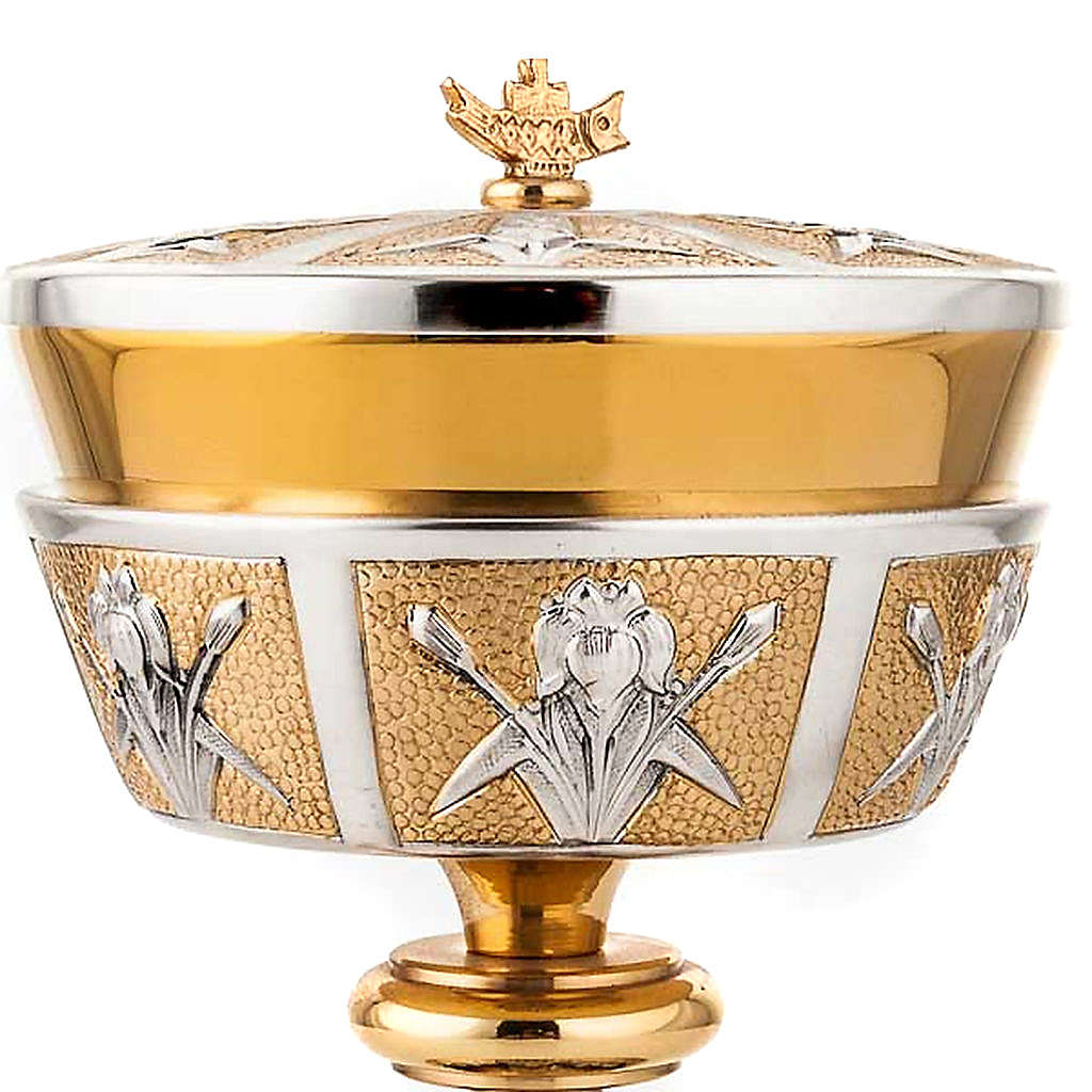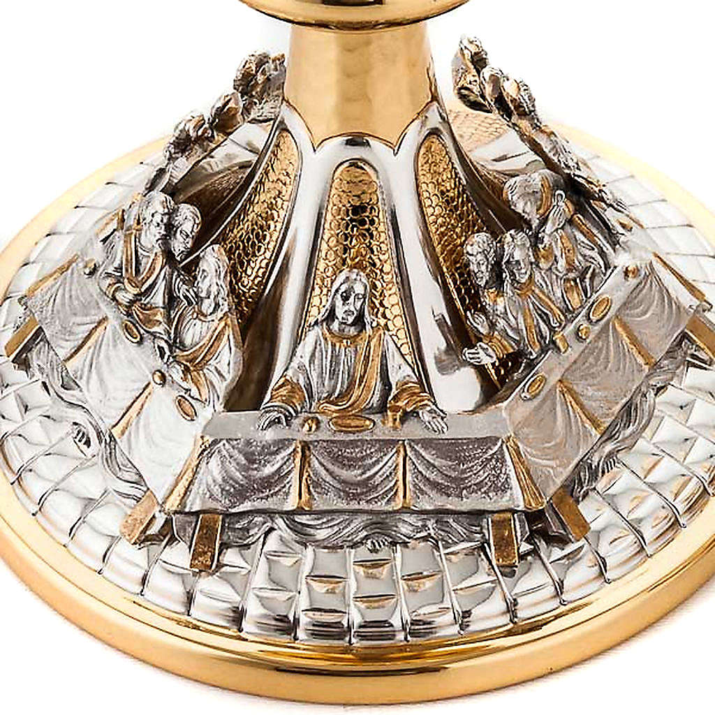 Cálice e âmbula cinzelados latão Última Ceia. Junto eucarístico composto por um cálice e uma píxide em latão bicolor com decoração da Última Ceia na base. A tampa da âmbula também é decorada.