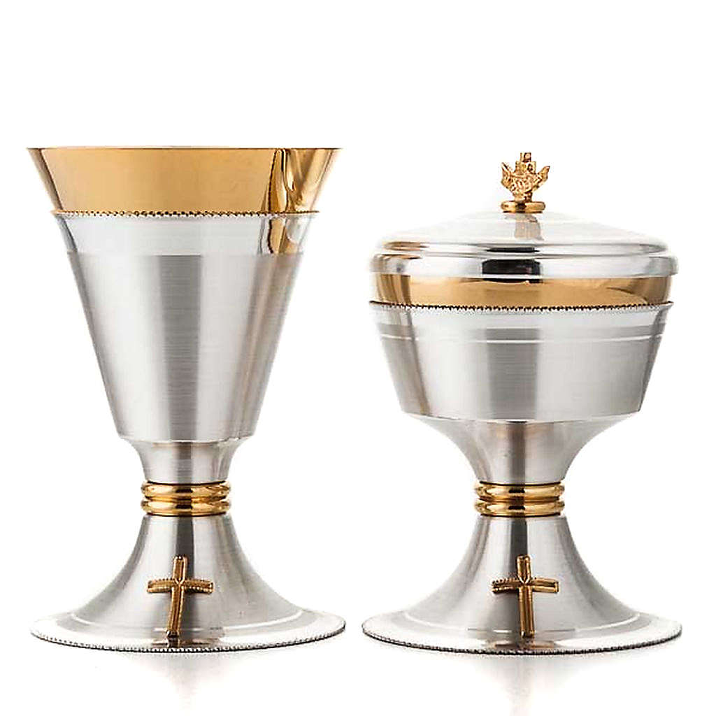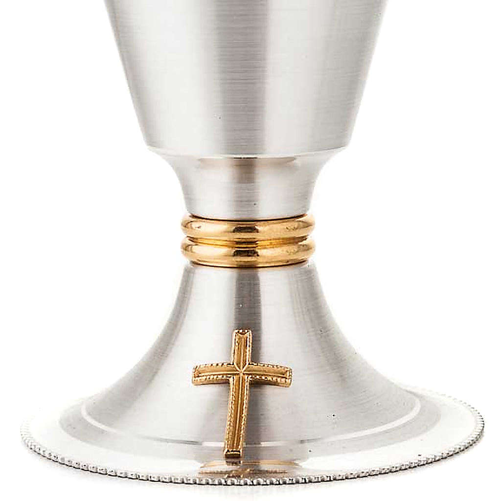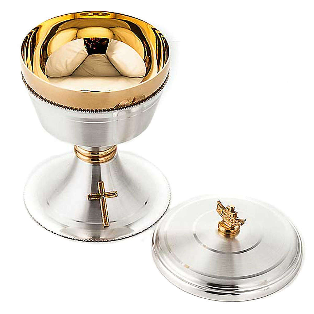 Cálice e cibório cruz latão acetinado. Cálice e cibório em latão prateado acetinado com copa dourada brilhante e base com uma cruz em bronze dourado.