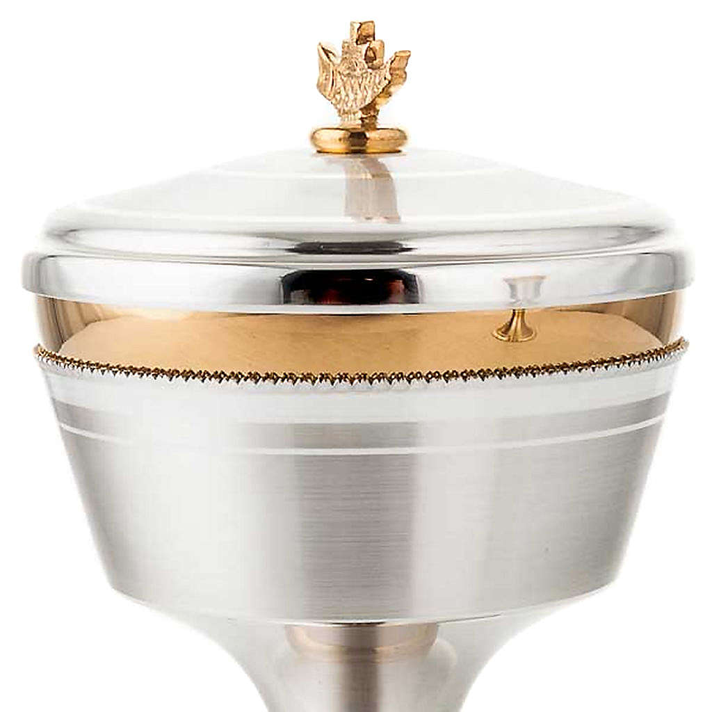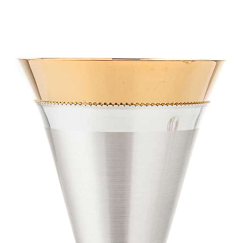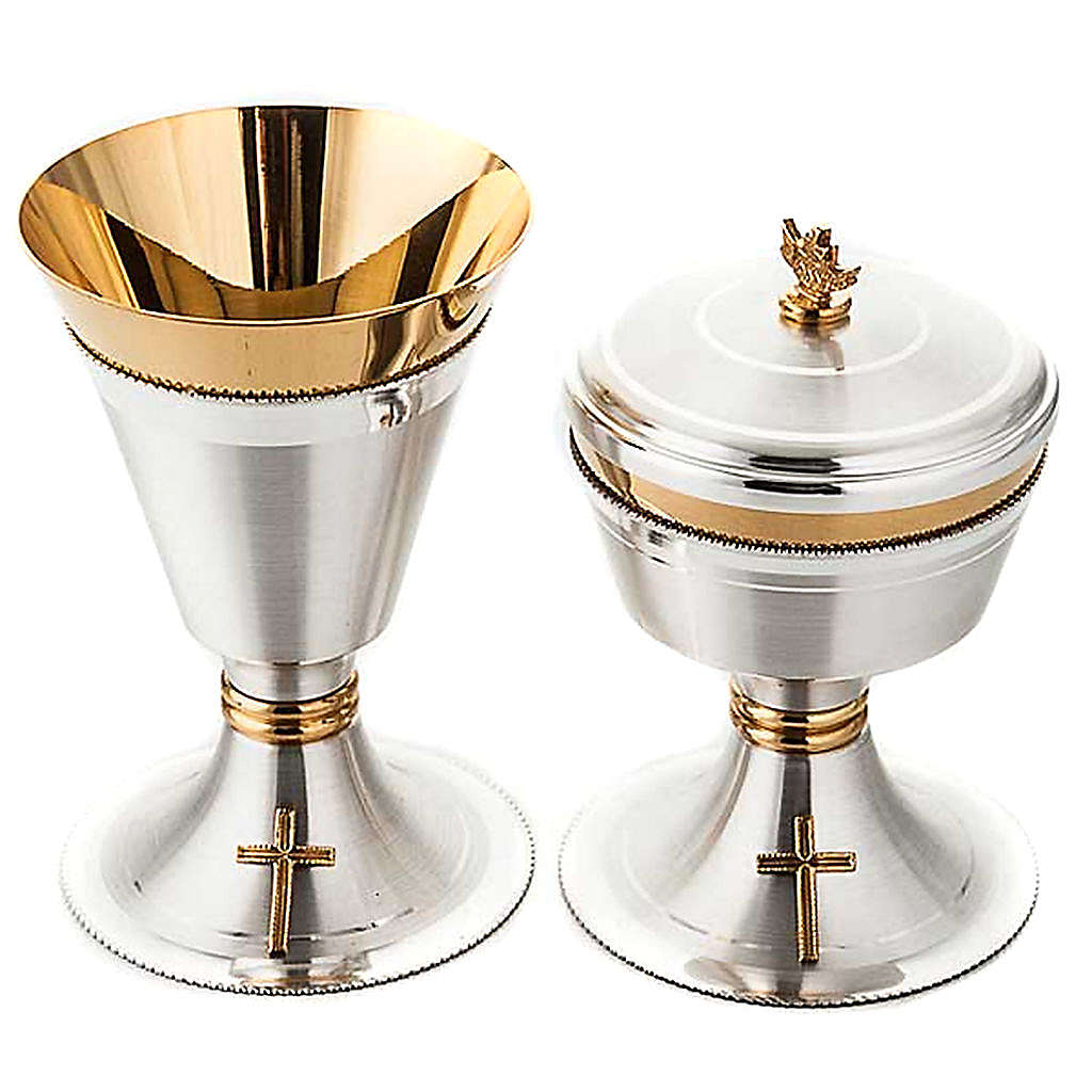 Cálice e cibório cruz latão acetinado. Cálice e cibório em latão prateado acetinado com copa dourada brilhante e base com uma cruz em bronze dourado.