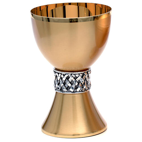 Cálice e cibório latão acetinado placa prata. Cálice e cibório em latão dourado acetinado ou brilhante com nó em placa de prata e resina.