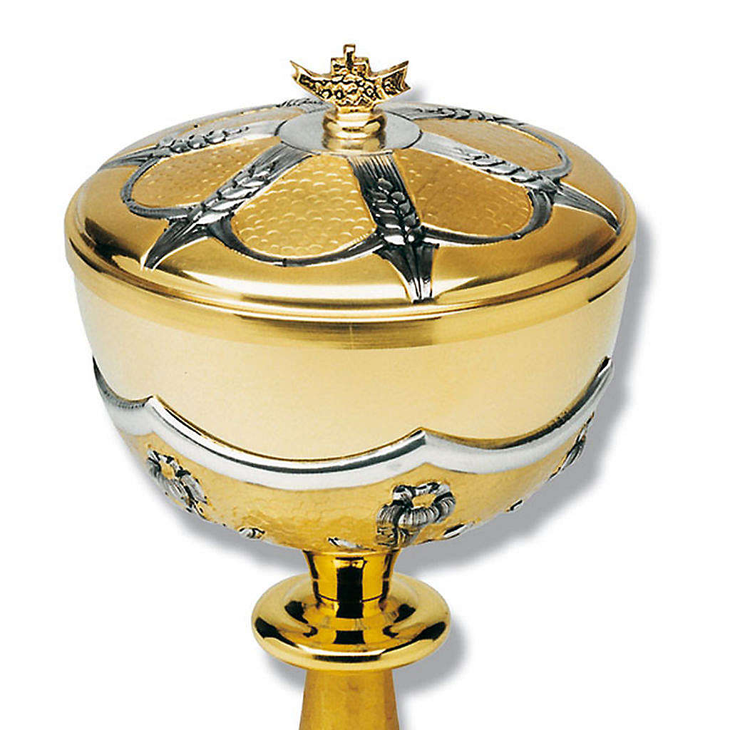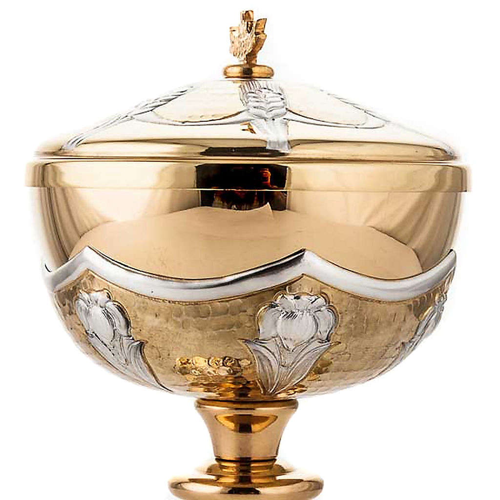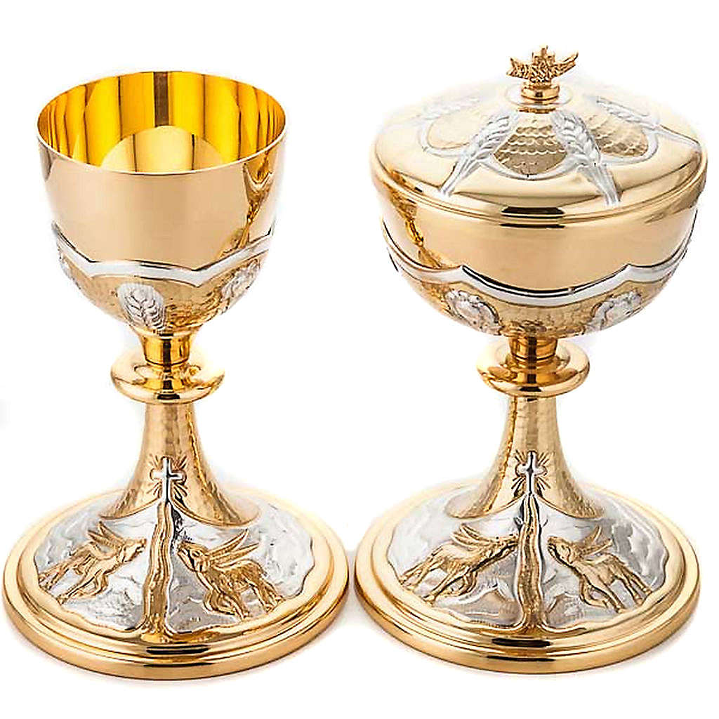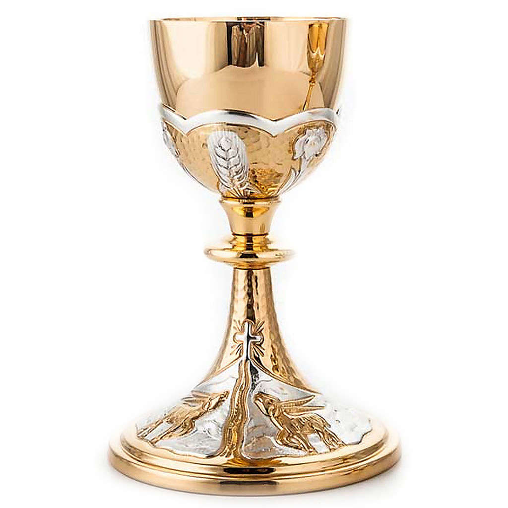 Cálice e cibório latão cinzelado cervos à fonte. Conjunto eucarístico composto por cálice e âmbula em latão cinzelado cor ouro e prata com imagem simbólica na base dos cervos que bebem à fonte. Ricas decorações de trigo na tampa do cibório.